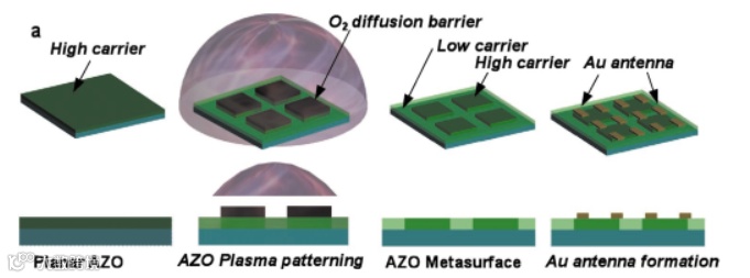 AZO的载流子浓度对其光电性质有着很重要的影响,除了通过改变AZO中的Al原子含量来实现对载流子进行调控,AZO薄膜厚度、沉积温度和退火也对其有影响,上述这些方法只能改变薄膜的的载流子浓度,不能实现局域调控AZO的载流子浓度。为此,南安普顿大学团队开发出了一种利用氧等离子体AZO载流子浓度的区域调控技术。该团队通过对4%Al原子含量的AZO薄膜进行20分钟的氧等离子体处理, 通过电学和光学的测试发现AZO的载流子浓度能够降低五个数量级(从1021到1016 cm-3),如图1所示。如果在正常的AZO薄膜上加工出能阻挡氧等离子体扩散的薄膜,例如Si3N4,(如图2所示),然后进行氧等离子体处理以及去除阻挡层的操作,就能得到表面平整的超表面器件。AFM显示通过该方法得到的器件表面在物理上是平面化的。