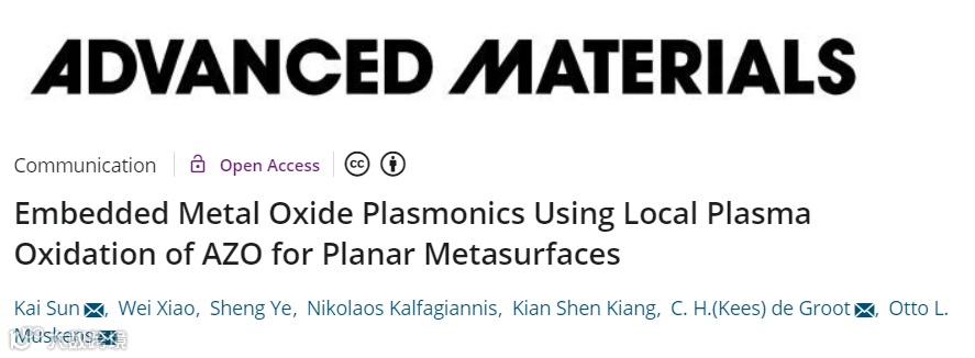 Kai Sun, Wei Xiao, Sheng Ye, Nikolaos Kalfagiannis, Kian Shen Kiang, C. H. (Kees) de Groot, & Otto L. Muskens (2020). Embedded Metal Oxide Plasmonics Using Local Plasma Oxidation of AZO for Planar Metasurfaces. Advanced Materials, 2001534.