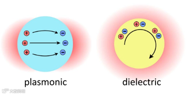 图一 等离激元和电介质纳米颗粒中基本共振和感应电流的示意图