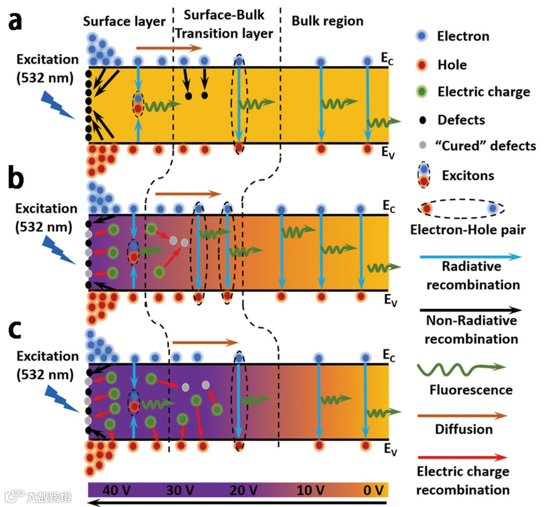 近日,中国科学院长春光学精密机械与物理研究所和吉林大学、美国罗切斯特大学合作提出了一种外加电场调控工程技术,可以无需添加任何化学试剂实现钙钛矿单晶中缺陷密度的调控,进而改善载流子传输过程,实现对载流子寿命、荧光强度和电阻特性的多重调控效果。