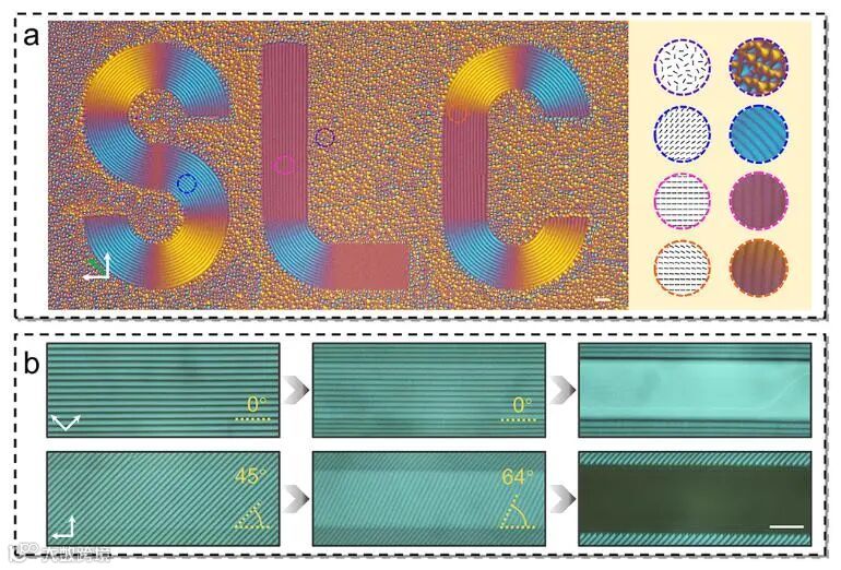 图2 缺陷图案化与动态调控(a)操控缺陷墙阵列成SLC形状;(b)电场调控缺陷指向。