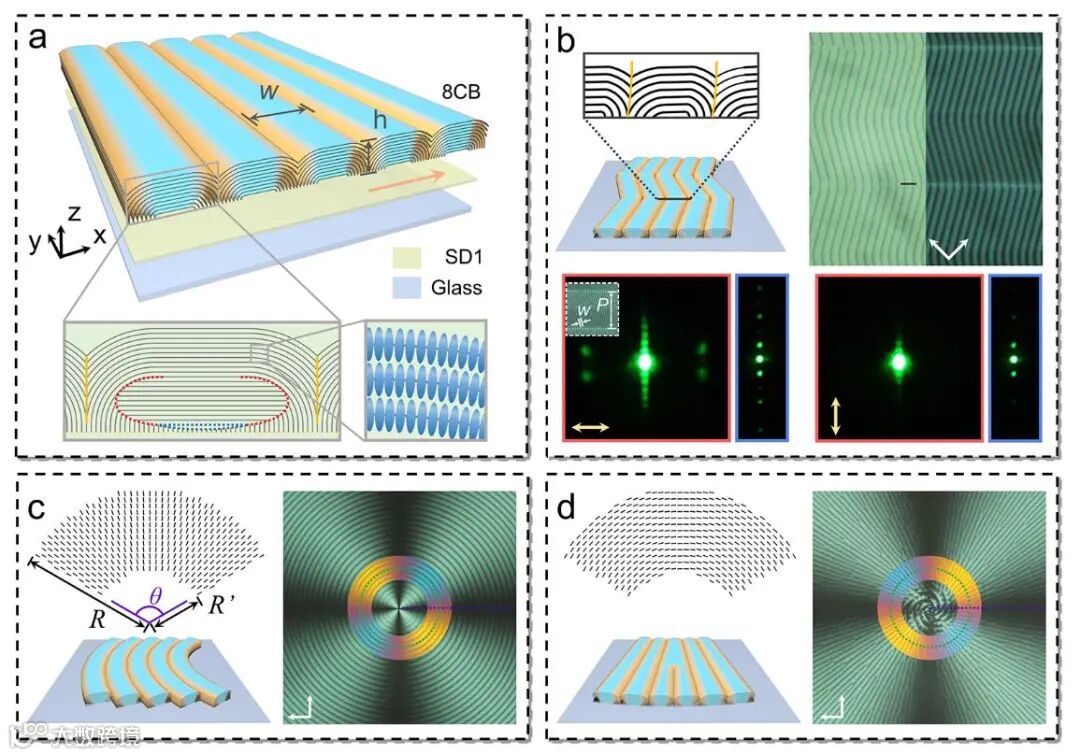 针对这一课题,研究团队利用光配项技术预设表面取向诱导近晶相分子层的空间分布,进而实现对缺陷墙的可编程控制器。文章中,通过预设方向交替变化的取向单元,将缺陷墙弯折成锯齿状,并研究了边界处结构随弯折角的演变规律;引入连续变化的径向取向,可诱导缺陷墙弯曲成特定曲率的平行弧线或螺线;而利用连续变化的角向取向,则使得缺陷墙发生扩展与叉形分裂。基于对上述弯折、弯曲和展曲等形变要素的灵活操控,研究团队利用取向诱导实现了缺陷墙结构的可编程控制,实现了一系列复杂图案的制备。进一步的,引入空间特定的电场刺激,可有效的调谐缺陷墙的间距、并能够实现缺陷阵列的面内旋转和动态开关等多维度动态操控。由各向异性的近晶相液晶组装成的油纹结构具有本征的指向矢分布周期变化的特征,因此表现出强烈的偏振依赖的衍射特性。基于上述拓扑缺陷的可编程控制,可以开发全新的液晶光子器件。