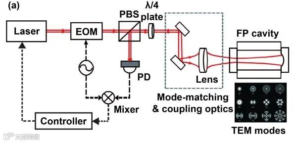 PDH稳频基本原理是将星载激光器的载波中心频率锁定到FP腔的共振频率峰上的方法。由于FP腔采用超稳一体化粘接技术,共振频率非常稳定,通过锁定后可以实现激光中心频率的稳定,进一步降低星间激光干涉测量中的激光频率噪声,其方案原理如图1所示。