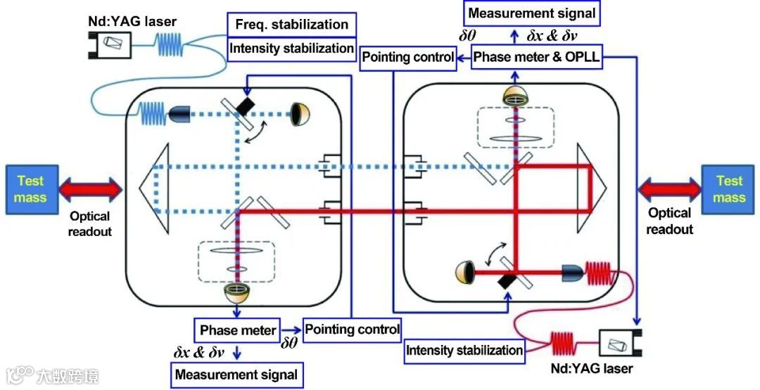 高精度星间激光干涉测量技术是发展空间科学应用、进行空间引力波探测的重要技术。中山大学天琴中心与华中科技大学引力中心针对我国自主的空间引力波探测计划—“天琴计划”的需求,积极开展高精度星间激光干涉测量关键技术的攻关,并取得了显著的进展,已初步建立起星间激光干涉系统方案,如图4所示。这些精密测量技术将逐步被应用于精密加工与制造、计量、前沿物理实验研究。