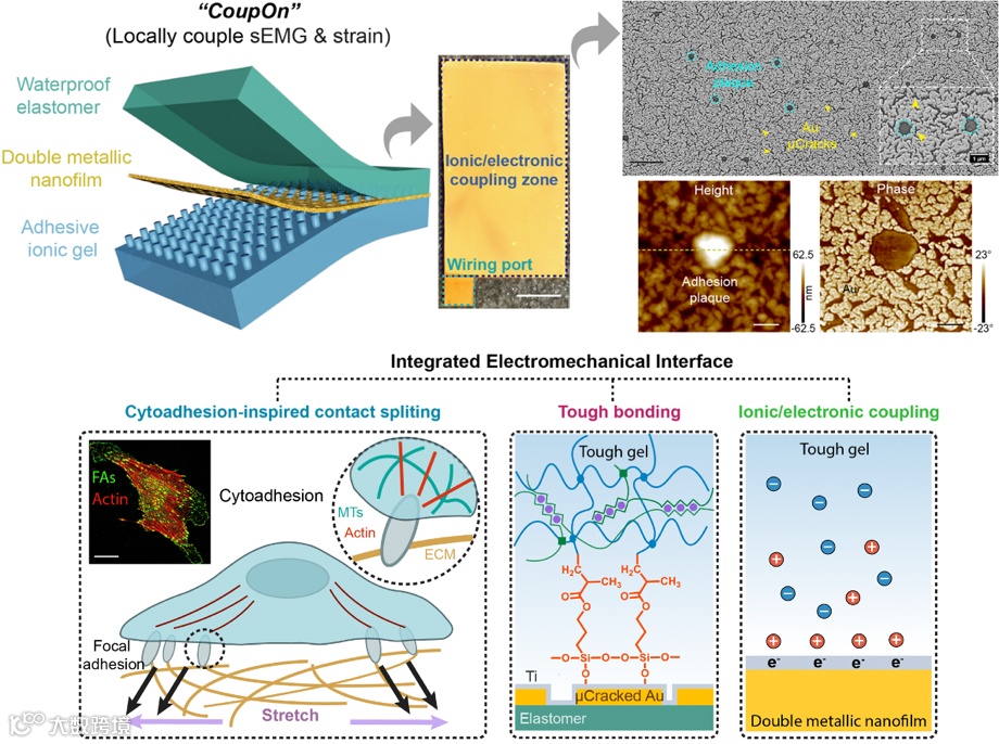 受细胞伪足粘附机制启发,该研究团队开发了多层复合贴片模拟了伪足的透膜结构及其与膜外配体特异性识别的特征。他们通过水凝胶穿透微裂纹金膜薄形成的“粘附斑”与钛金属层和弹性体薄膜形成界面化学键和,制备了由离子水凝胶、金/钛双层金属纳米薄膜和弹性体薄膜组成的四层复合贴片(简称CoupOn)(图2)。该复合贴片可同时同地监测肌肉收缩过程中表面肌电信号和力学应变,从而捕捉肌肉动作过程的激发-收缩特征;其肌电信号信噪比可达32.2dB,应变计灵敏系数可达34。此外,CoupOn复合贴片与皮肤粘附力可达15 N/m,兼具良好的共形能力,使得其皮肤接触阻抗低至商业电极Vitrode的30%左右。弹性体上热蒸镀形成的微裂纹金膜被广泛用于应变传感器,而CoupOn复合贴片中脆性钛金属纳米薄膜和水凝胶的引入进一步提高了其应变灵敏系数约10倍,且拉伸率仍维持在100%以上。