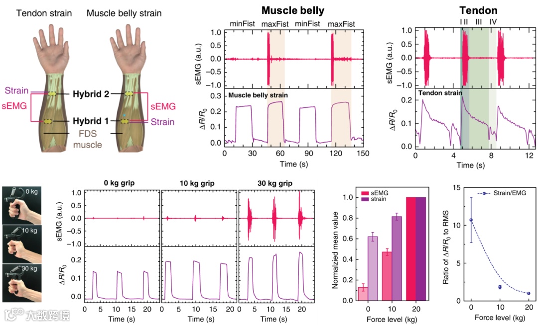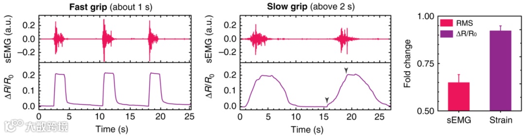 该研究团队进一步以前臂浅屈肌 (flexor digitorum superficialis (FDS) muscle) 为对象,系统验证了肌肉的局域力电耦合特征与手部动作的关联性,并发现力电耦合特征和效率不仅与监测位点相关,同时受动作力度和速度的影响(图3)。前臂浅屈肌通过其位于腕隧道下的肌腱与食指、中指、无名指和小拇指的掌指关节和指间关节相连,并控制四个手指的弯曲动作。他们发现,在最小力度的握拳动作中 (minFist) 仅产生一个明显的应变平台,而在最大力度的握拳动作中 (maxFist) 则产生了相对略高的应变平台以及一个显著的肌电信号峰,这也验证了单一肌电信号用于手势识别存在盲区。他们进一步发现,同样完成maxFist动作时,位于肌肚处同位于肌腱处的贴片应变信号差异显著;位于肌腱处的应变包含更多细节,甚至可以用于辅助识别单个手指的弯曲,这也验证了抓取力电耦合特征时局域性的必要性。通过比对11名志愿者在对抗不同力度握力计的激发-收缩特征,该研究团队亦发现这种耦合效率存在个体差异;而普遍的规律是,力电耦合效率会因动作力度而异,其中应变信号对低力度端动作更灵敏,而肌电信号对高力度动作更为灵敏。除了监测位点和力度外,该团队亦发现握拳速度对肌肉的力电耦合的影响(图4)。相较于快速握拳(1秒内),慢速握拳(2秒以上)产生的应变仅下降不到10%,而其对应的肌电信号则显著下降了近35%。