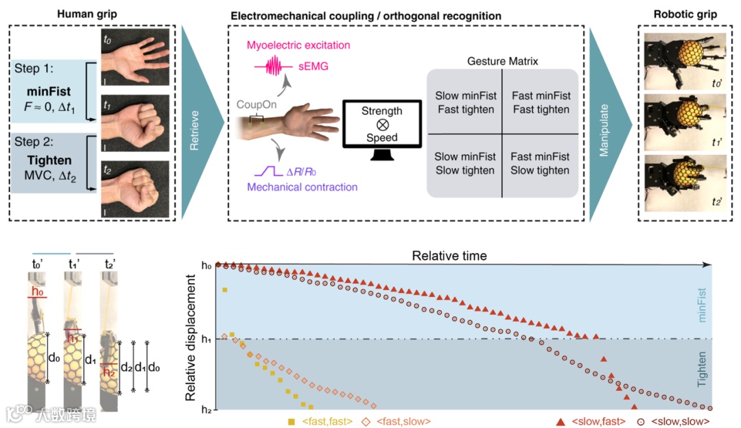 基于该力电耦合界面对抓握动作中力度和速度的响应性,该团队进一步正交识别了抓握物体时四类情况,并操纵机械手复制对应抓握动作的动态过程(图5)。实际抓握过程被粗略分为两个步骤:1)手掌包覆目标物,不施加抓握力(minFist);2)施加抓握力,抓起目标物。通过控制这两个步骤的动作速度,该团队抓取了四类抓握情况的力电耦合过程,即慢包慢握,慢包快握,快包慢握和快包快握。并转变成机器指令控制机械手完成同样抓握动态过程。