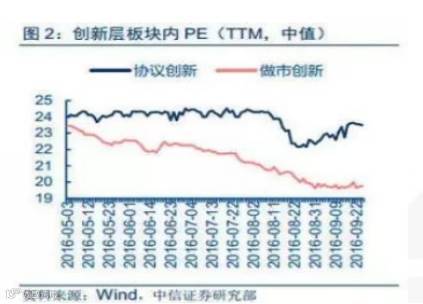自6月推出分层制度后,创新层的整体估值一直在基础层之下。创新层中做市企业估值低于协议转让估值。