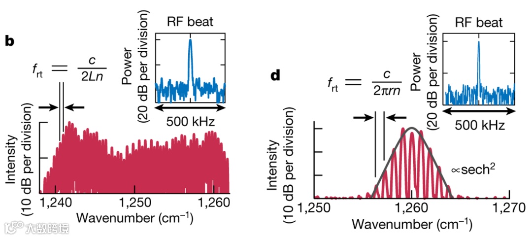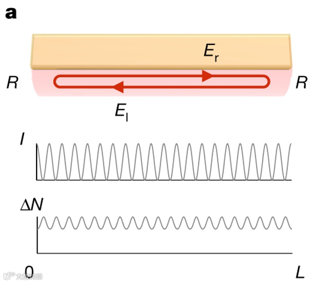为了产生频率梳,需要在腔中存在能够在不同频率下产生模式、耦合模式并锁定其相位的机制。在微谐振器中,超过参数不稳定性阈值时,外部泵浦会引发边带,该边带会通过级联参数过程而增长并扩散。这种相干的非线性过程引起了锁相频率梳。在Fabry–Pérot半导体激光器中,多模运转是由非均匀增益饱和引发的,而腔内驻波(图1a)导致增益的空间变化,称为空间烧孔(SHB)。在色散腔中,SHB导致非等距频率的模式激增,并且由于增益介质本身的非线性效应可以实现相位锁定。