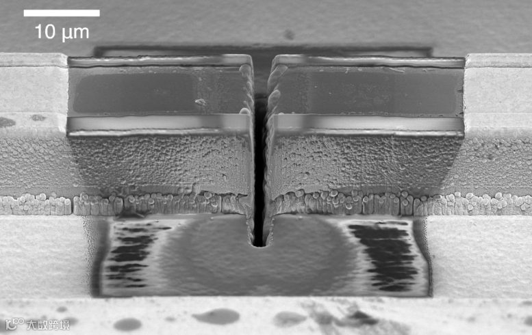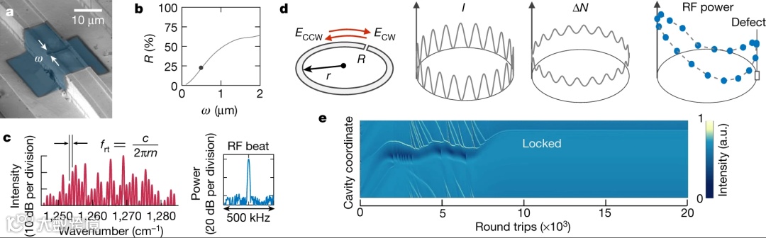 因此在环形腔中,必须有意引入类似的反射点(缺陷)。研究人员通过聚焦离子束光刻技术在环形激光波导上蚀刻一条狭窄的缝隙(图6a),以在激光器的工作物质区域中形成气隙。实验表明,加入缺陷的环形QCL产生的频率梳与没有缺陷的环形QCL的频谱截然不同(图6c),光谱具有不规则的包络线(这是复杂的激光模式竞争的结果)