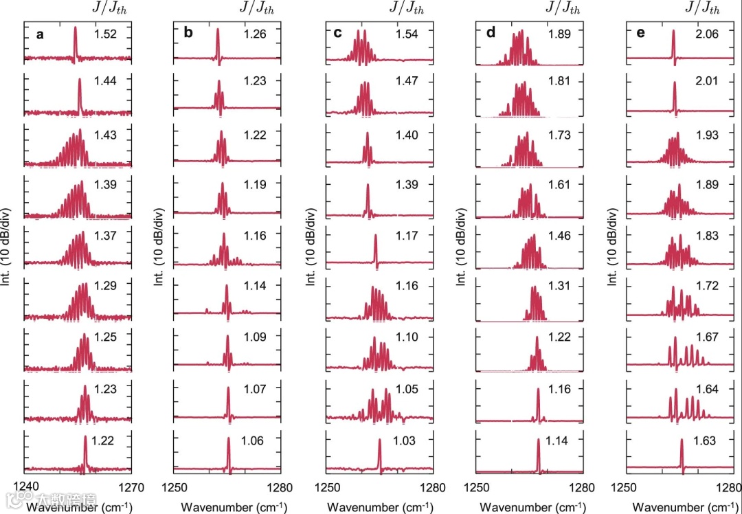 环状QCL可以发出中红外光,并在恒定电注入的情况下可以在室温工作,在注入水平仅略高于激光阈值Jth的情况下,环形激光器会经历向多模态的过渡(图3),这与在Fabry-Pérot QCL观察到的明显不同。