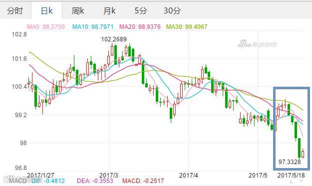 避险资产大放异彩,黄金、美债、日元纷纷走高。截至17日收盘,美国10年期国债收益率收报2.216%,为4月19日以来的最低水平。纽约商品交易所6月份交割的黄金期货结算价当天上涨1.8%,至1257.5美元/盎司,为3月16日以来的最大单日涨幅,也是4月28日以来的最高收盘水平,至此金价已连续六个交易日收涨。美元指数加速下探,大幅下跌逾0.4%至97.79,刷新去年11月特朗普胜选以来的新低,美元兑日元刷新5月2日以来低点至111.56,大跌逾1.2%。