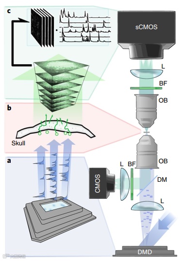 近几十年来,新奇的“光工具”在神经科学领域建立了新的范式。其中,荧光功能指标的出现彻底改变了我们在不同动物模型中通过大脑监测信息处理的方式,具有前所未有的对比度、分辨率和特异性。用这种方法,光学分辨率通常不是最重要的,通常只需要粗(细胞)分辨率。此外,当神经元的位置是已知的,就有可能不需要借助缓慢的光栅扫描技术,并在高帧率的情况下只对需要的位置成像。脑组织通常是不透明的,在大脑深处发出或传递的光经常很快受到多次散射的影响。这导致了几个散射长度(相当于几百微米)后方向性的丧失,并最终意味着所有的宽视野或扫描显微镜技术都无法在较大深度处得到有效利用。虽然一些生物体的大脑足够小和/或透明,可以对其进行完整成像(例如,秀丽隐杆线虫、果蝇或斑马鱼),但哺乳动物的大脑,从最常见的动物模型——老鼠开始,因其大脑太大,光散射性太强,因此无法完整成像。当对表层成像时,就有可能用多点式多光子激发或用宽带激励和后端去激发来实现宽场记录,利用少量的前向散射光或弹道光子作为种子光来分离单个神经元的贡献。然而,通过大脑皮层或头骨观察超过一毫米的神经元活动仍然极具挑战性。