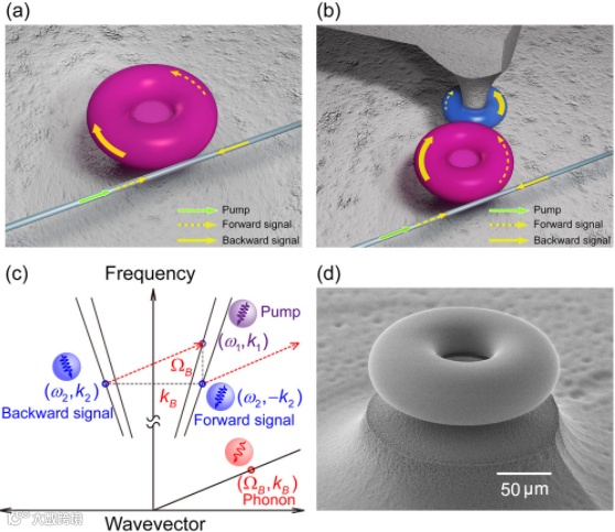 近日,来自南京大学、美国芝加哥大学和肯尼索州立大学的联合研究团队展示了一种基于芯片的可调谐全光隔离器。该隔离器基于高品质因子硅基微环谐振器,其物理根源来自于体受激布里渊散射(SBS)。与大多数最先进的器件相比,该器件具有显著的优点,包括高隔离比、无插入损耗和大工作功率范围等。由于声学导波及相关的动量守恒条件,体SBS也有助于实现两个直接耦合微谐振器中的非互易时空对称性。时间反演对称性破缺的成功实现为许多集成光学器件,例如单向单模布里渊激光器和超灵敏光子传感器等,打开了新的大门。(朱学艺)