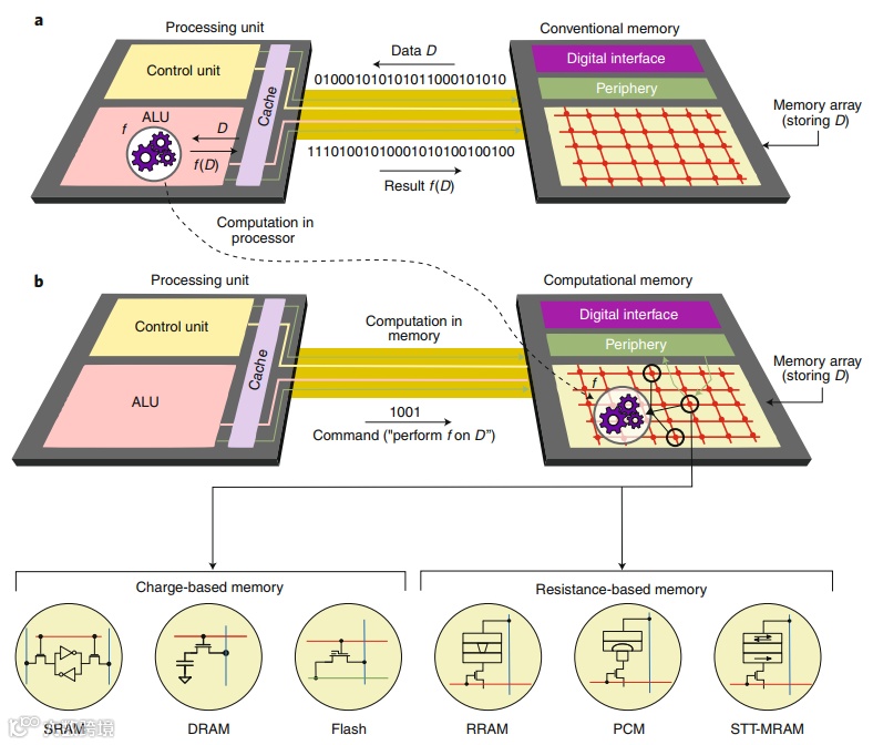 今天的计算系统主要是建立在冯·诺依曼架构的基础上的,在这种架构下,数据必须被移动到一个处理单元。在执行各种计算任务期间,需要在处理单元和内存单元之间来回切换大量数据,这将带来巨大的延迟和能量消耗。从内存单元访问数据的延迟是一系列应用程序的关键性能瓶颈,特别是对于日益突出的与人工智能(AI)相关的工作负载,使这个问题更加严重。这就需要彻底脱离传统的系统,而非冯·诺依曼的计算方法之一就是内存计算。因此,某些计算任务是通过利用存储器设备的物理属性在存储器本身中执行的。基于电荷和基于电阻的存储设备都被用于内存计算。