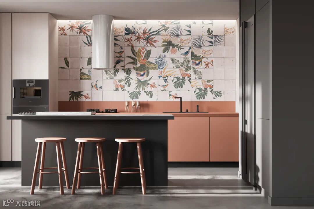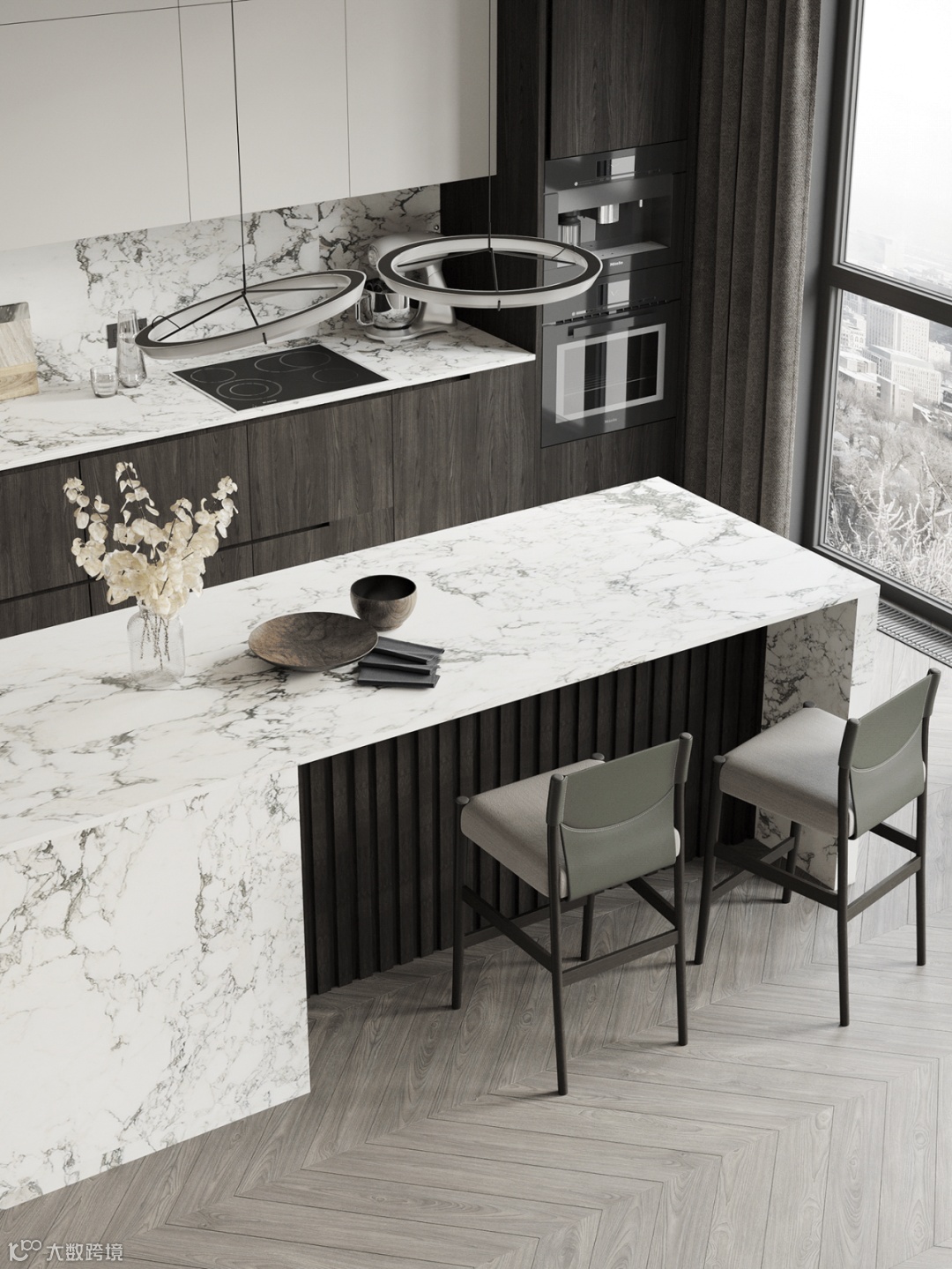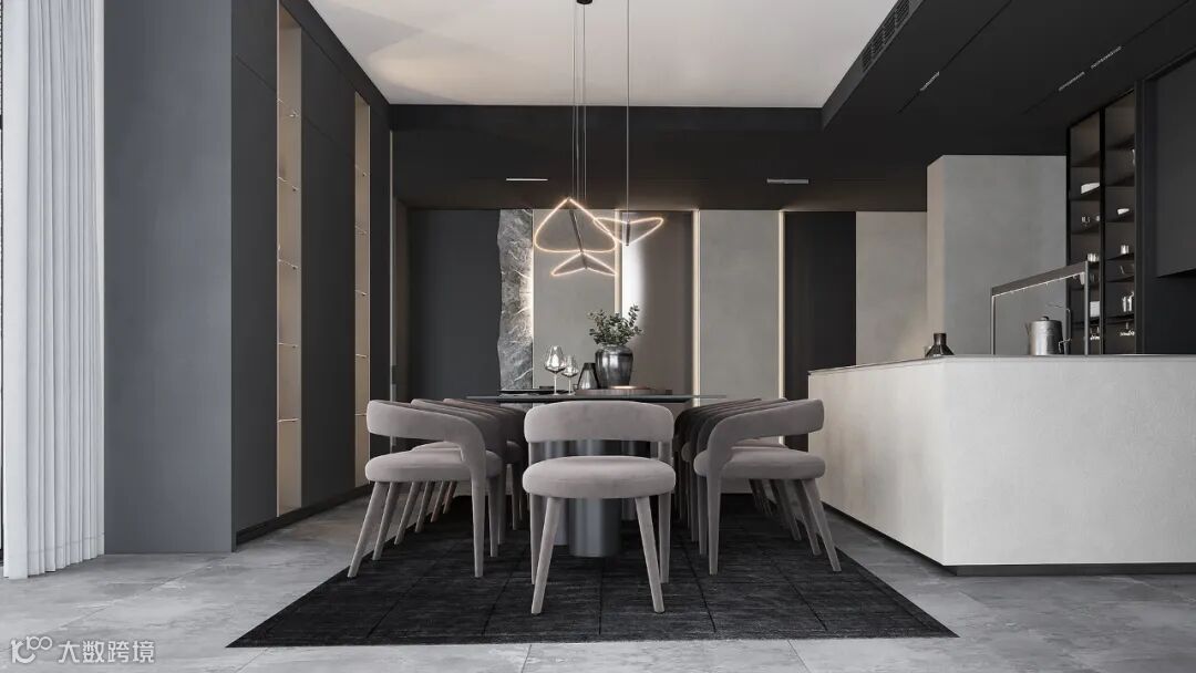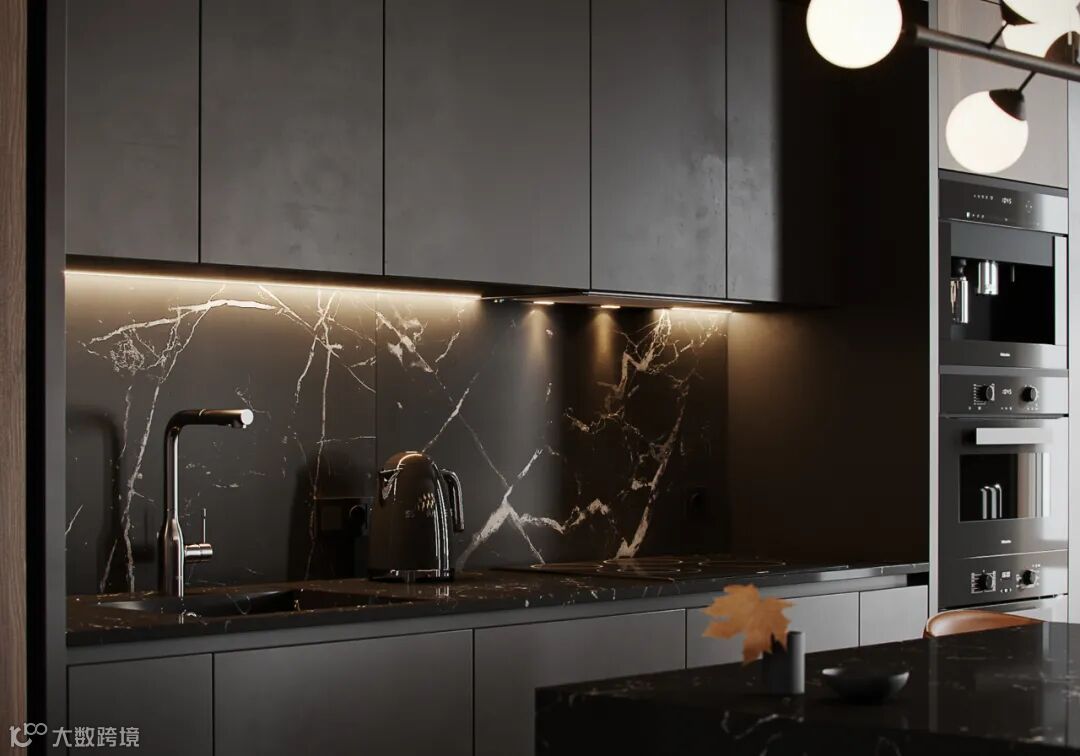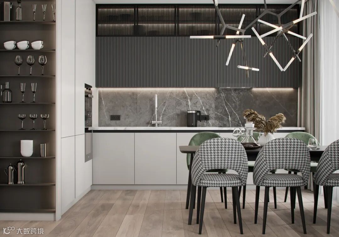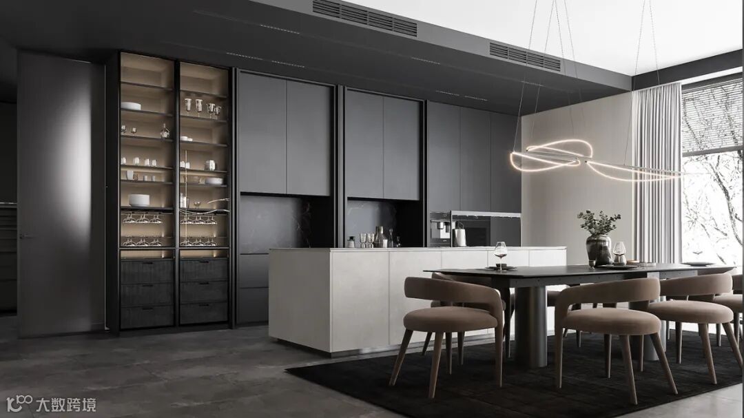 橱柜系统由上至下,以长虹玻璃、栅格、岩板与肤感板进行铺设。