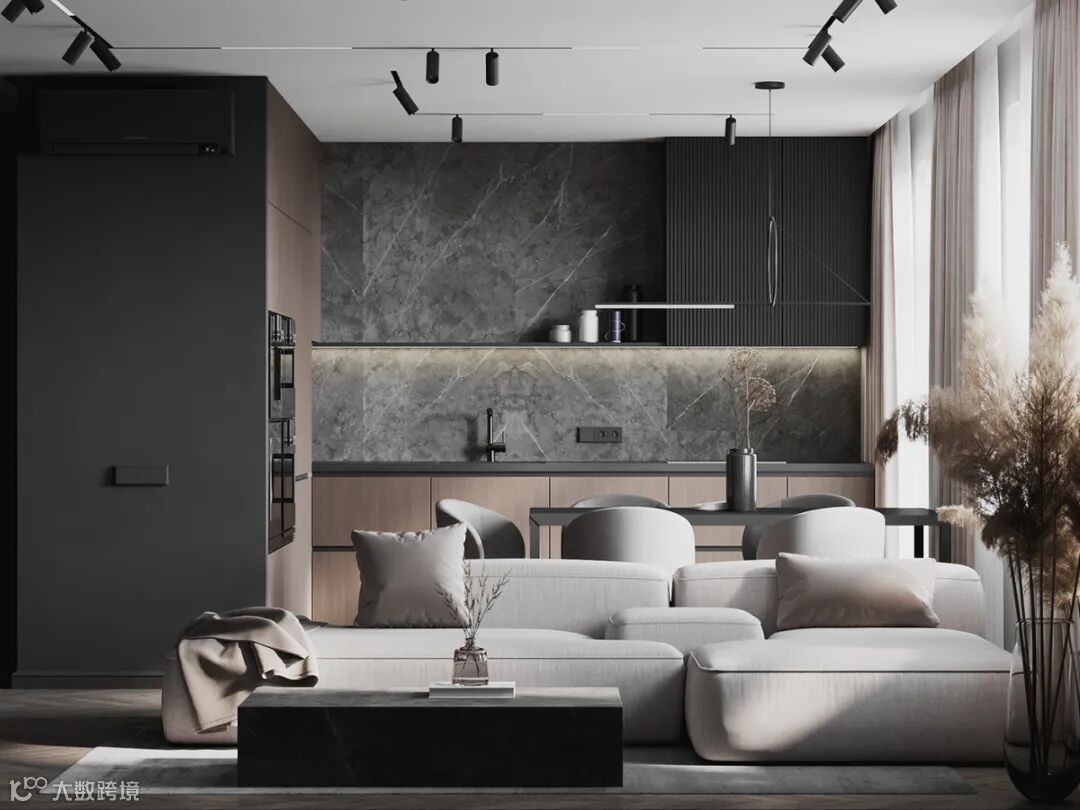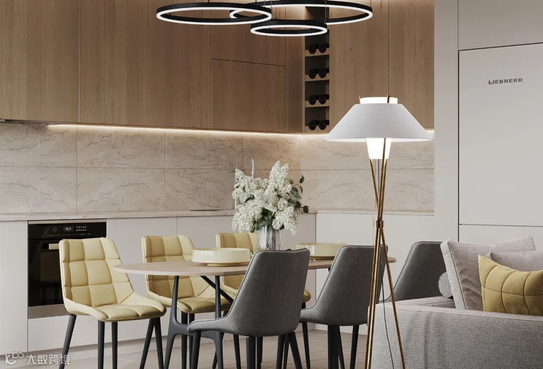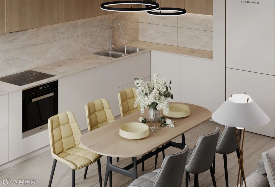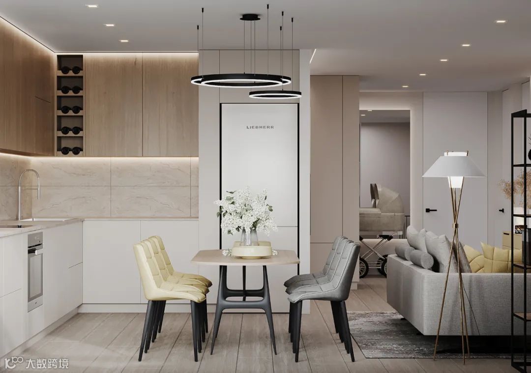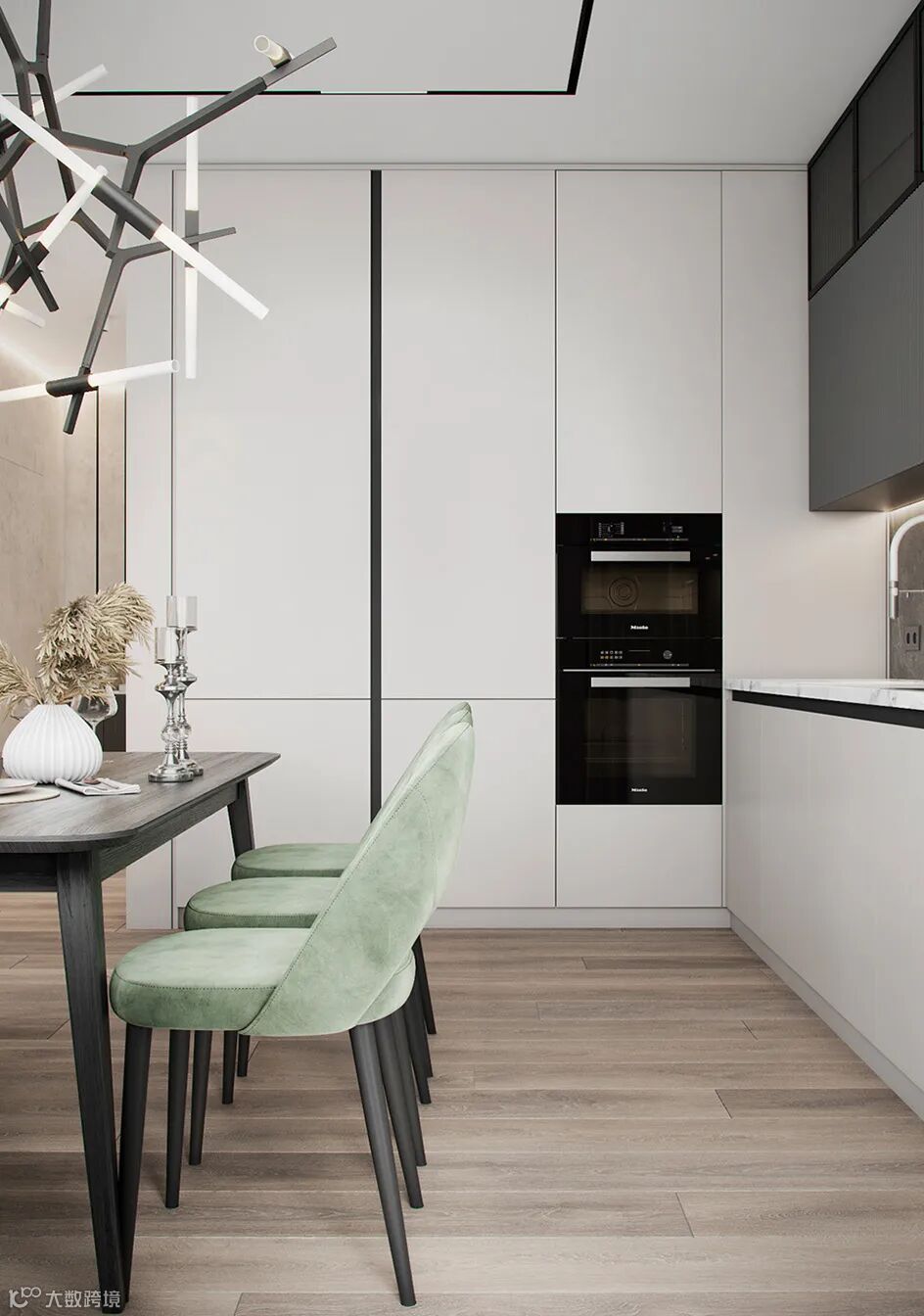 L型落地橱柜,无把手的简致立面,带来了舒适而优雅的视觉传达。