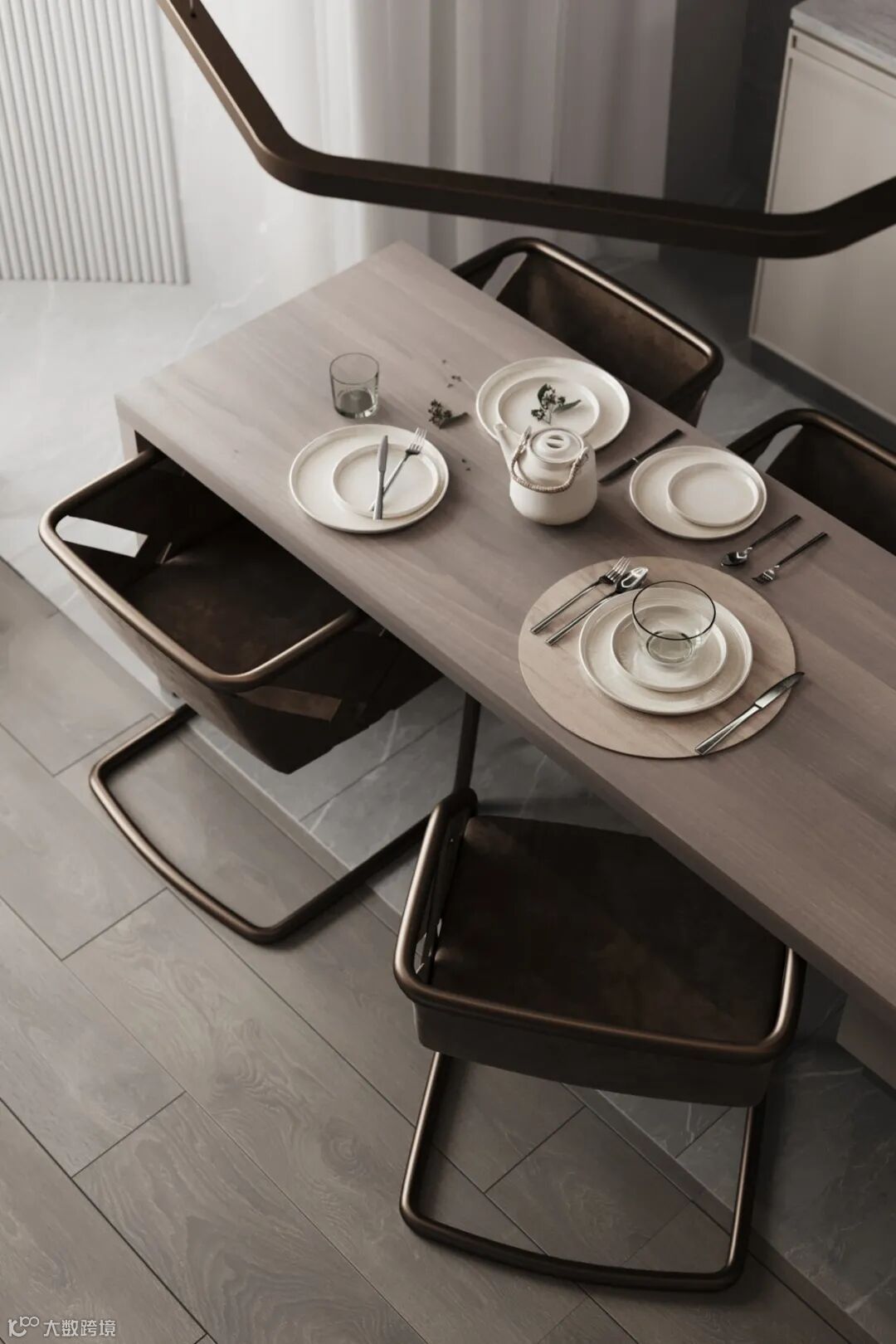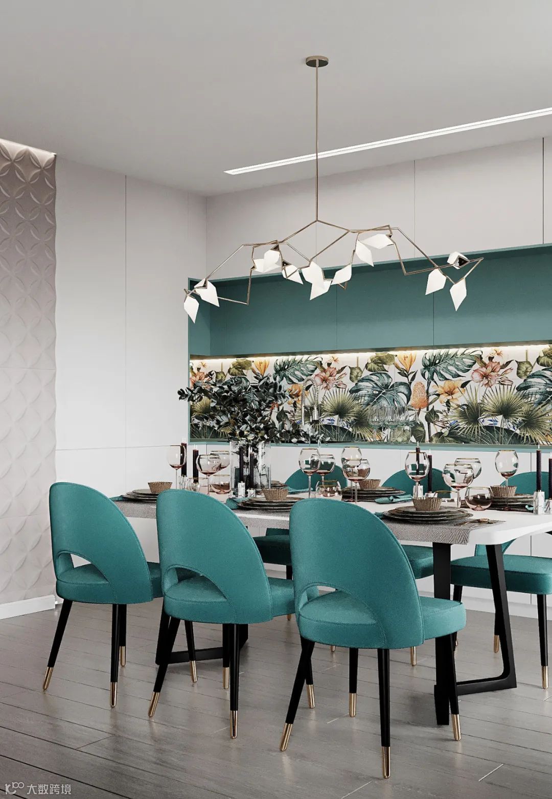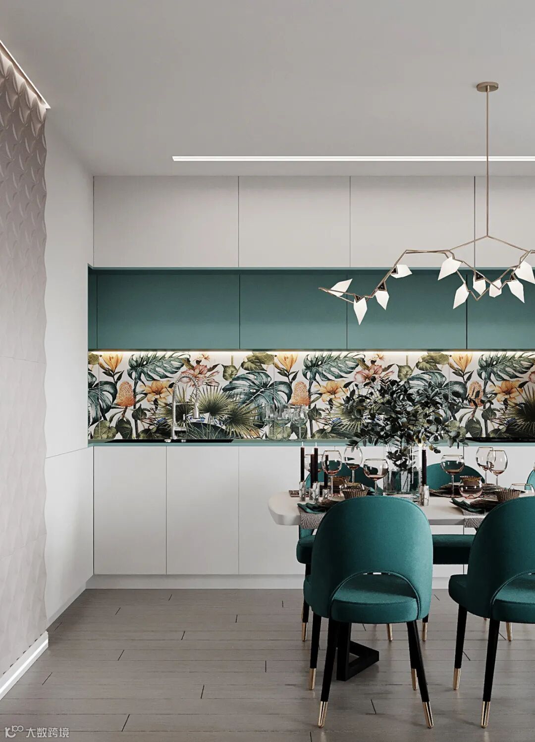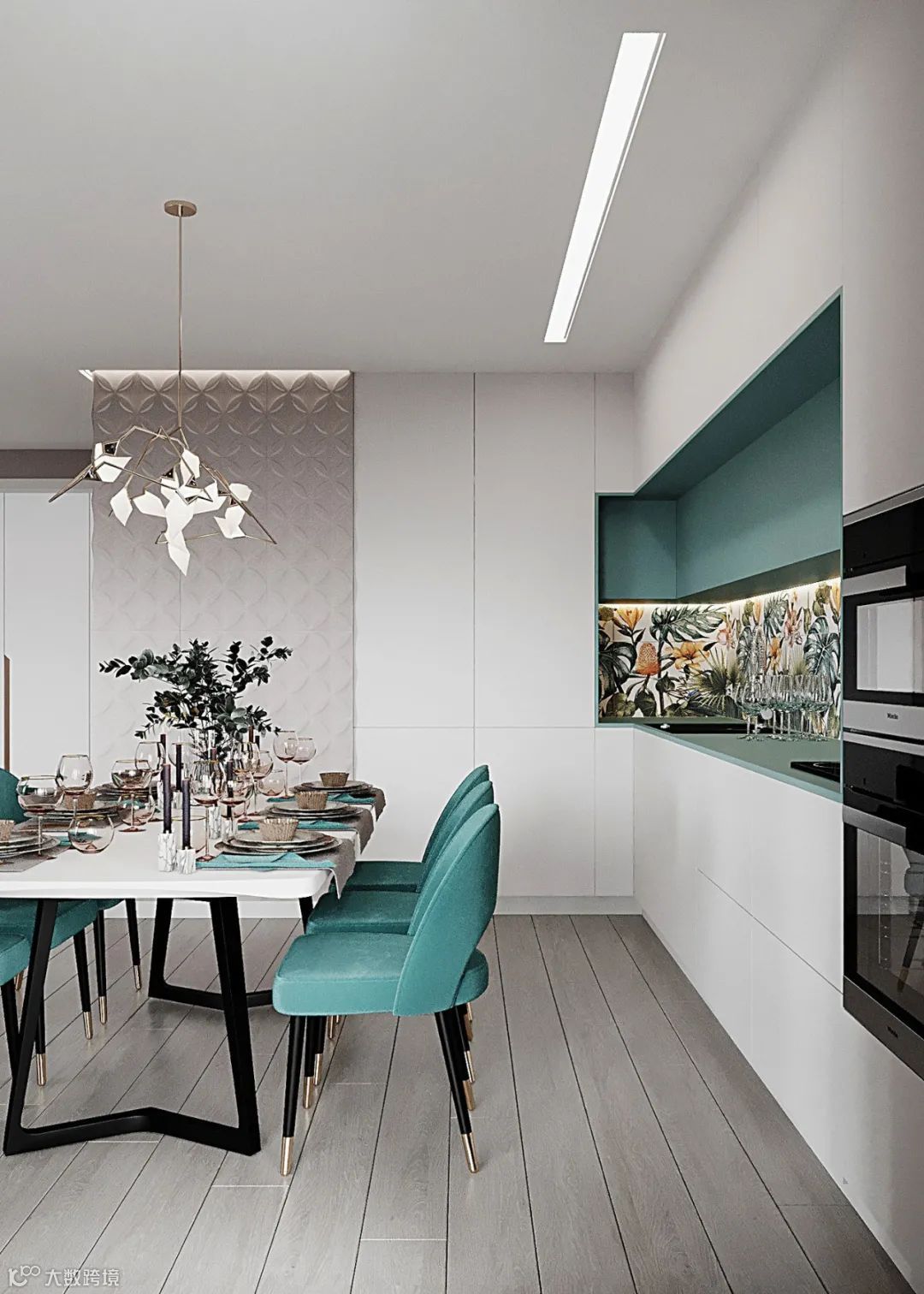L型落地橱柜,无把手的简致立面,带来了舒适而优雅的视觉传达。