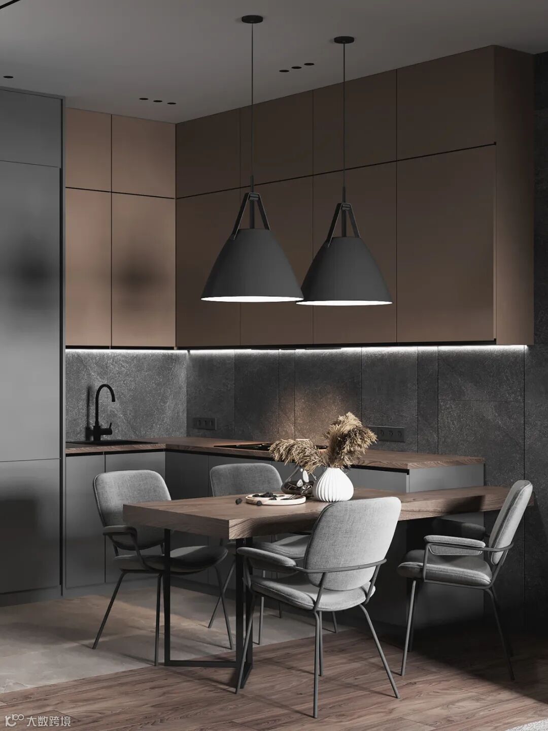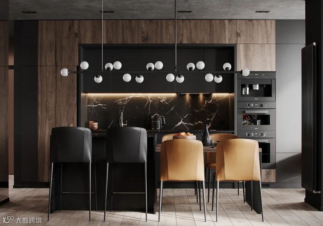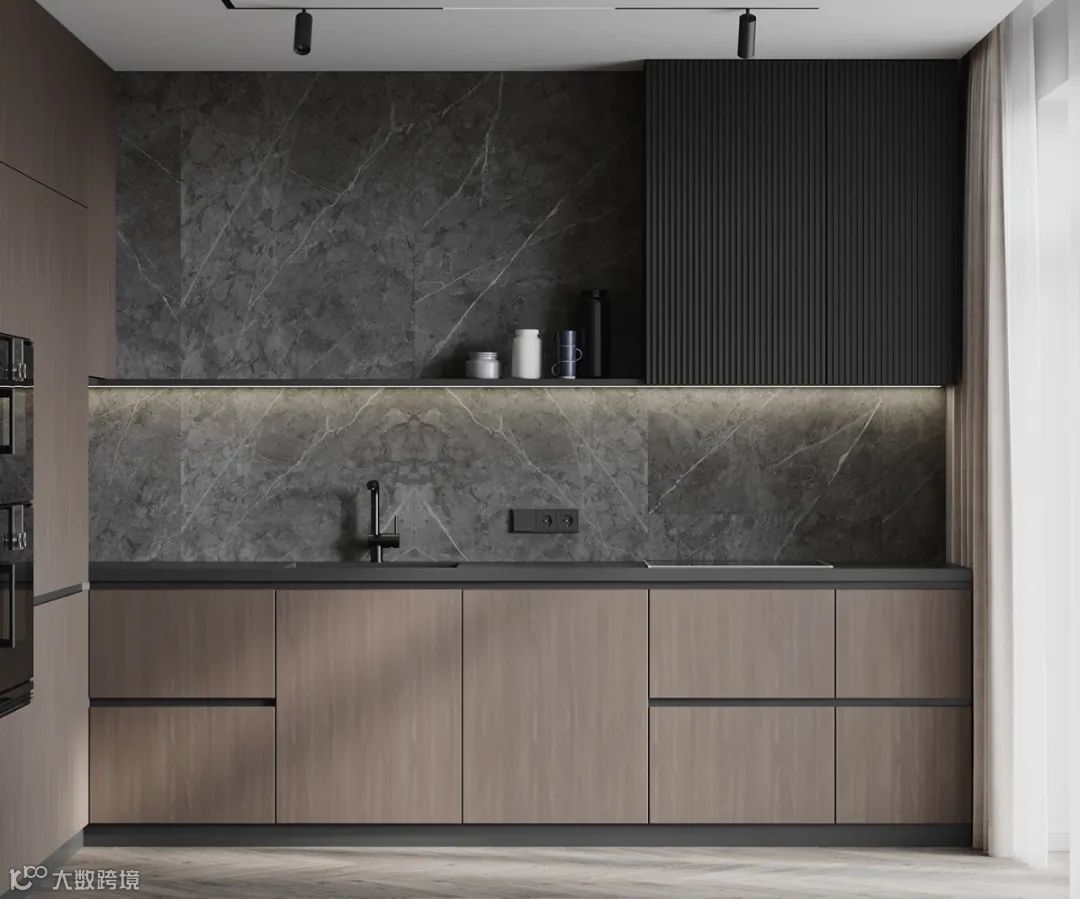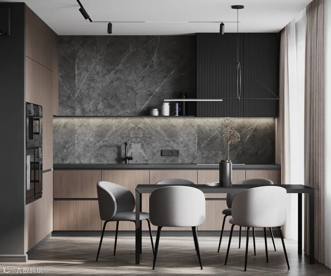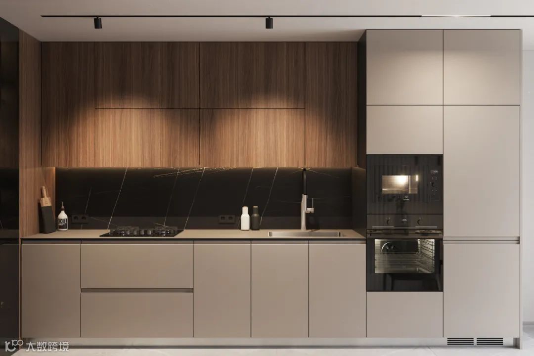 静谧优雅的厨房空间,自带高级的亲和力,另一侧整面墙的木饰面呈现,简致又彰显大气。