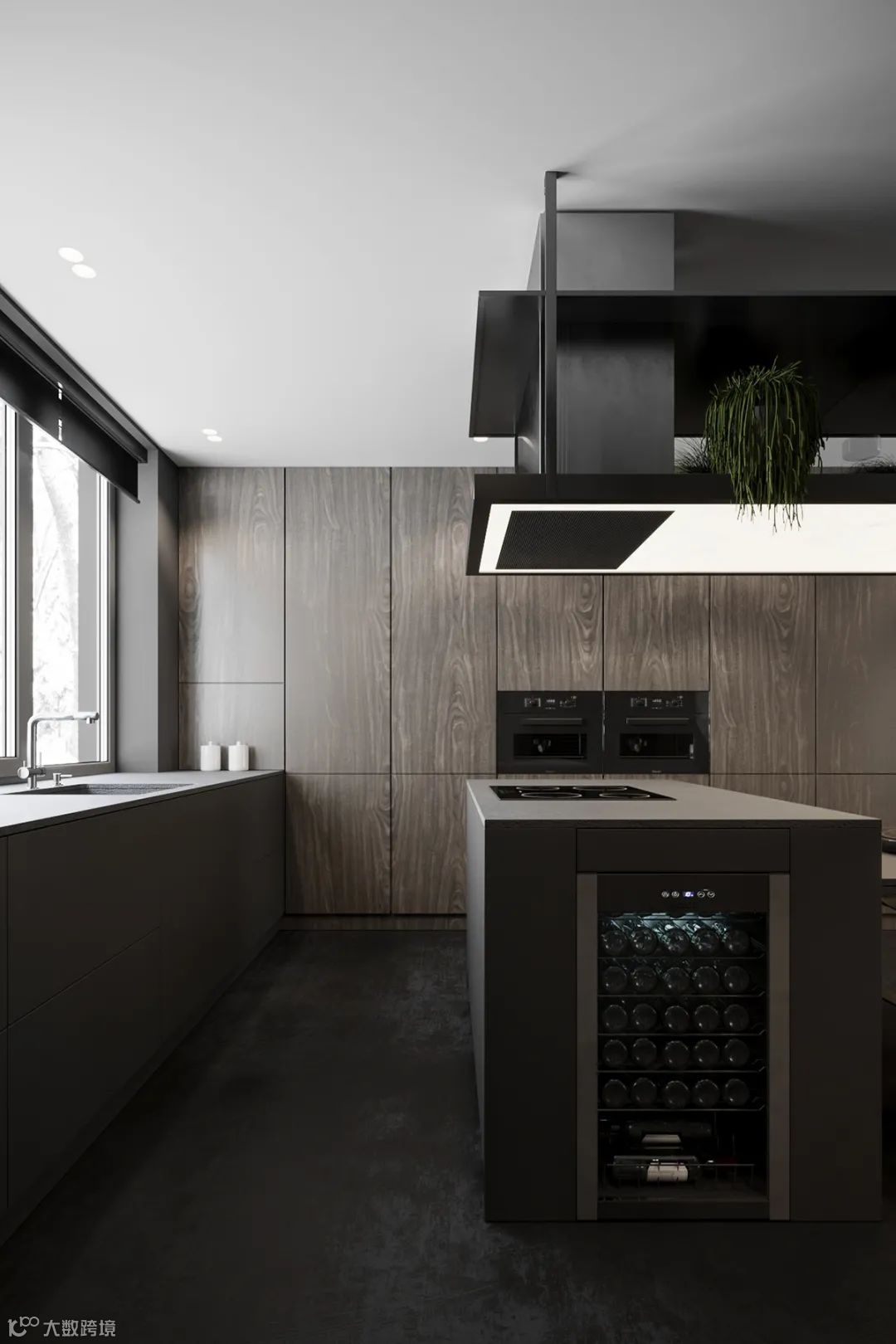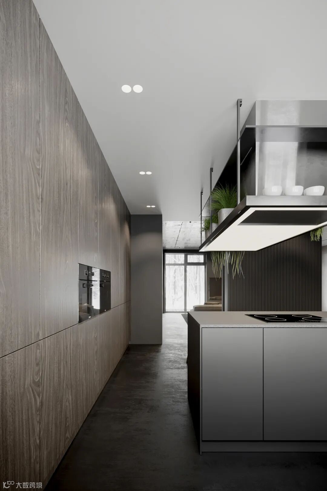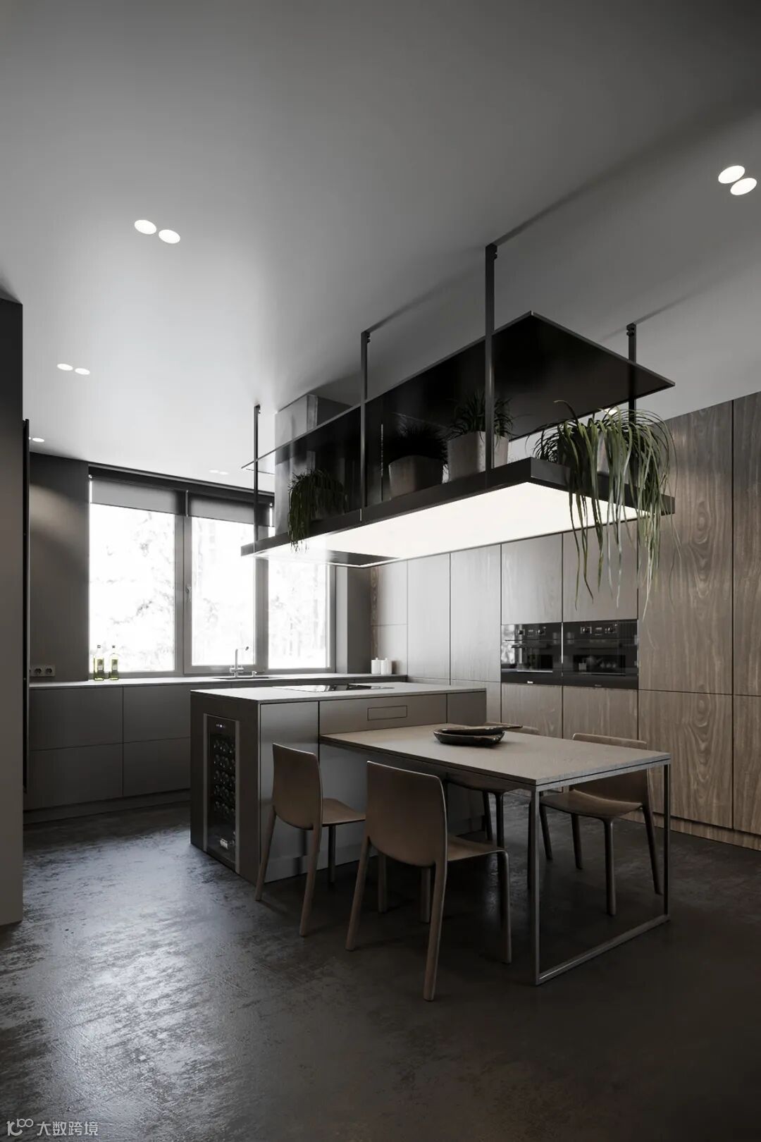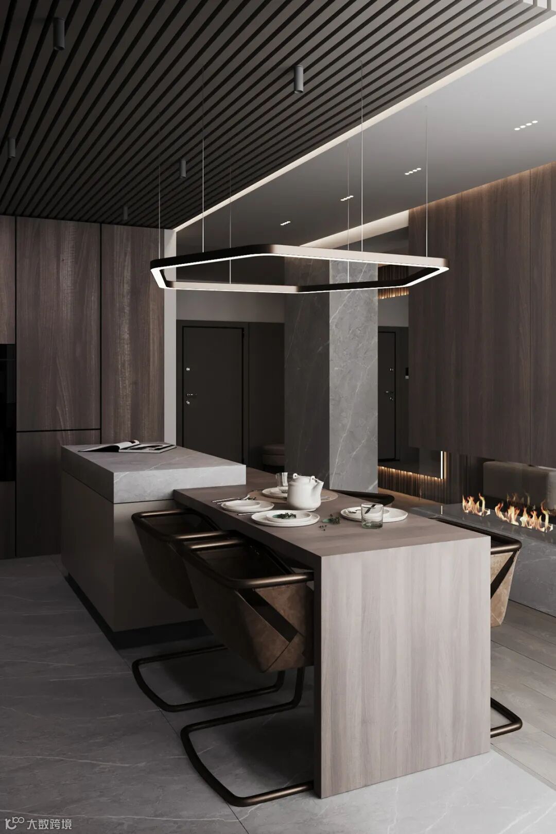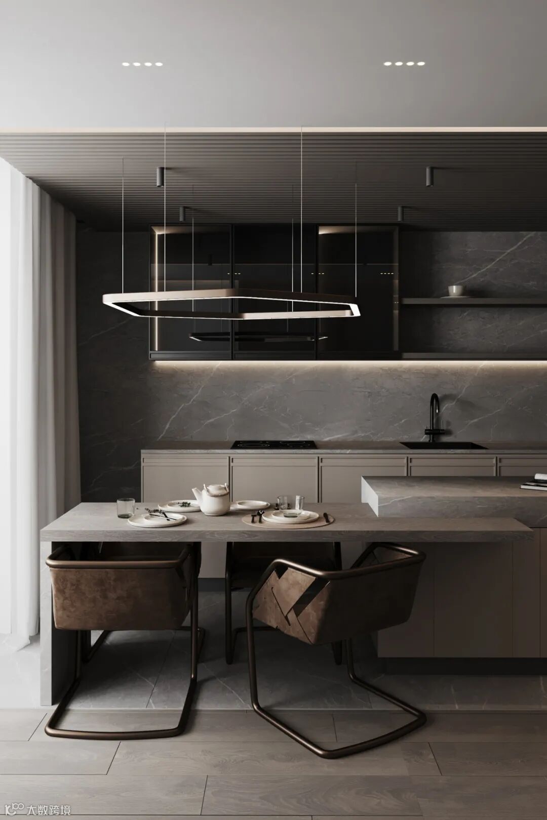 静谧优雅的厨房空间,自带高级的亲和力,另一侧整面墙的木饰面呈现,简致又彰显大气。