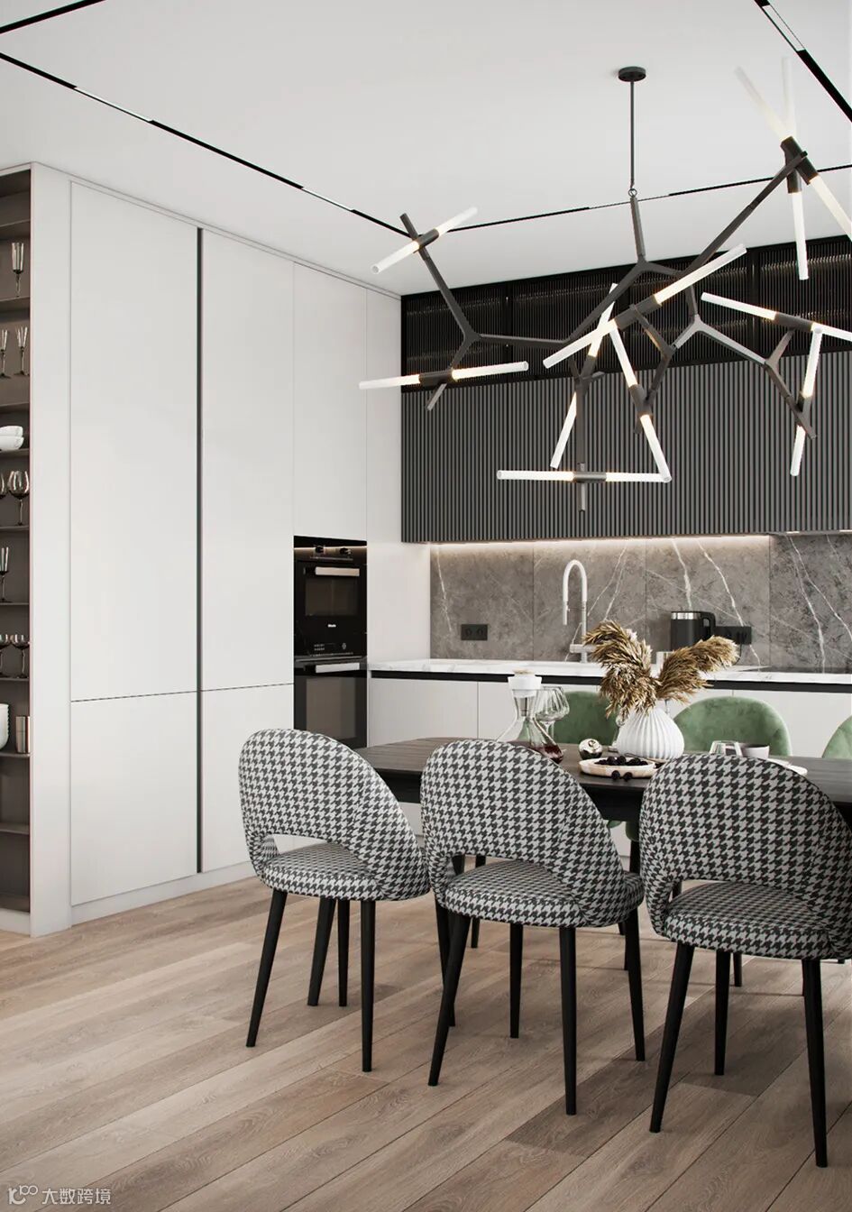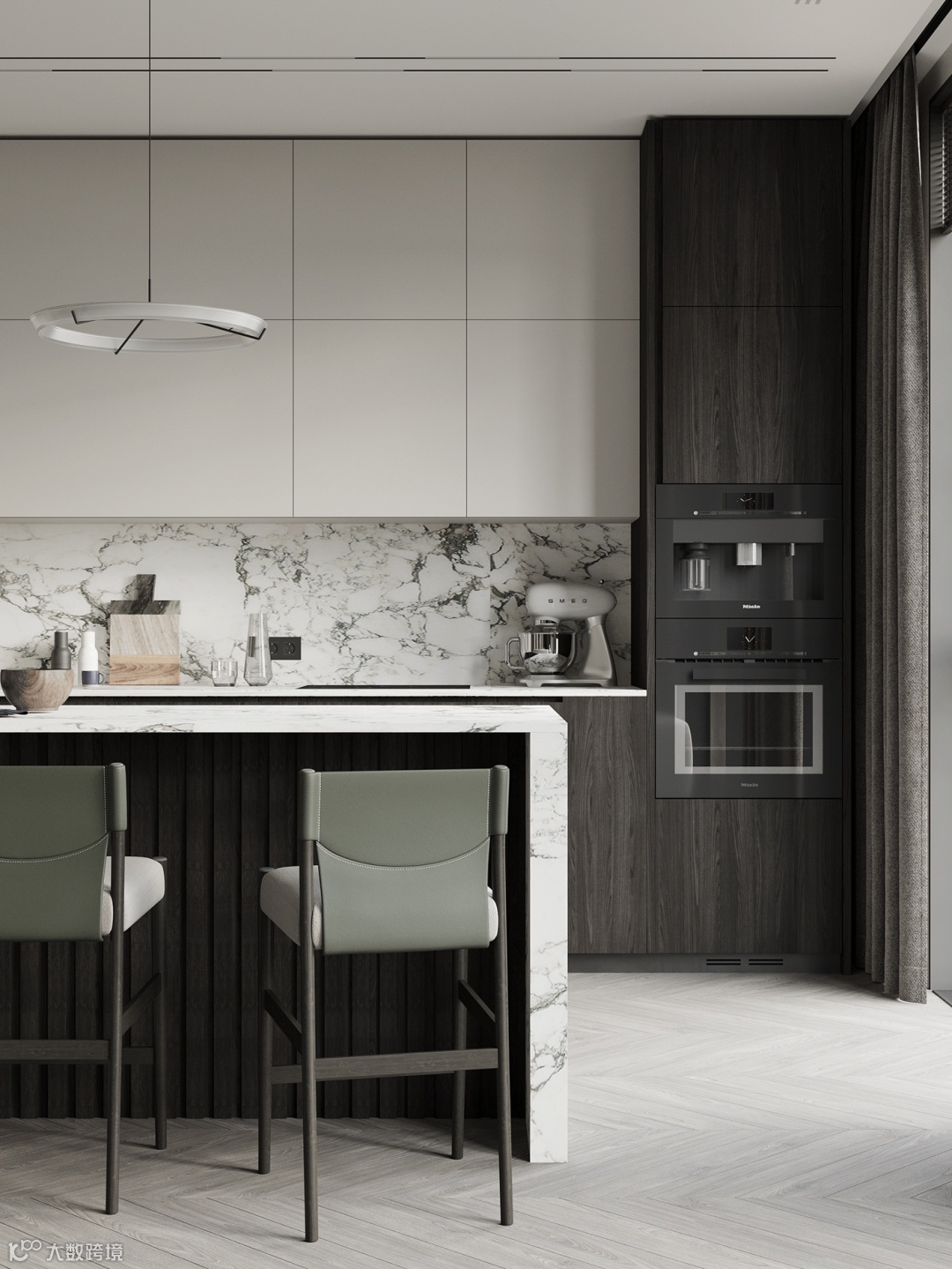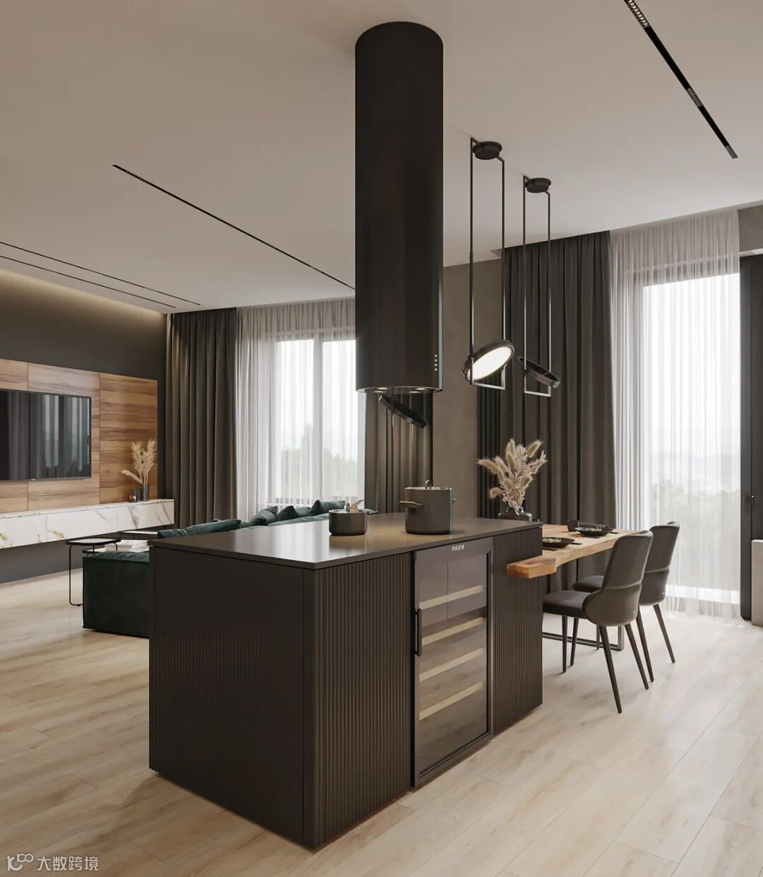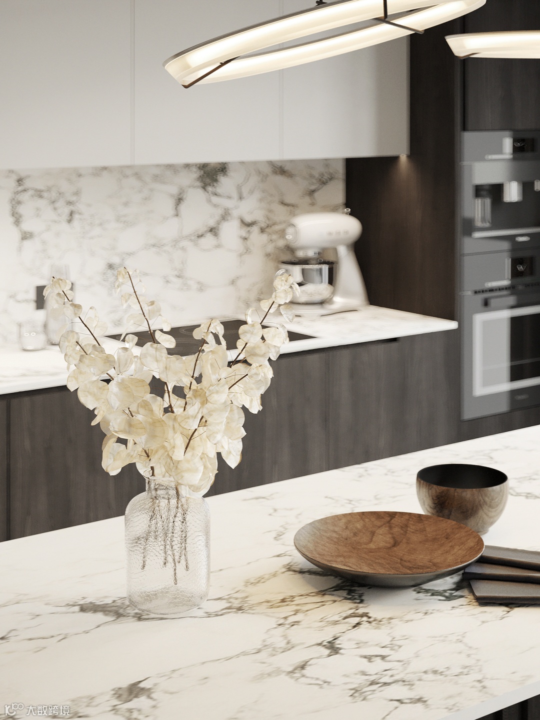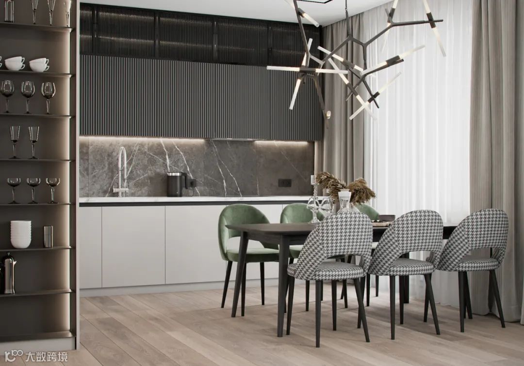 静谧优雅的厨房空间,自带高级的亲和力,另一侧整面墙的木饰面呈现,简致又彰显大气。
