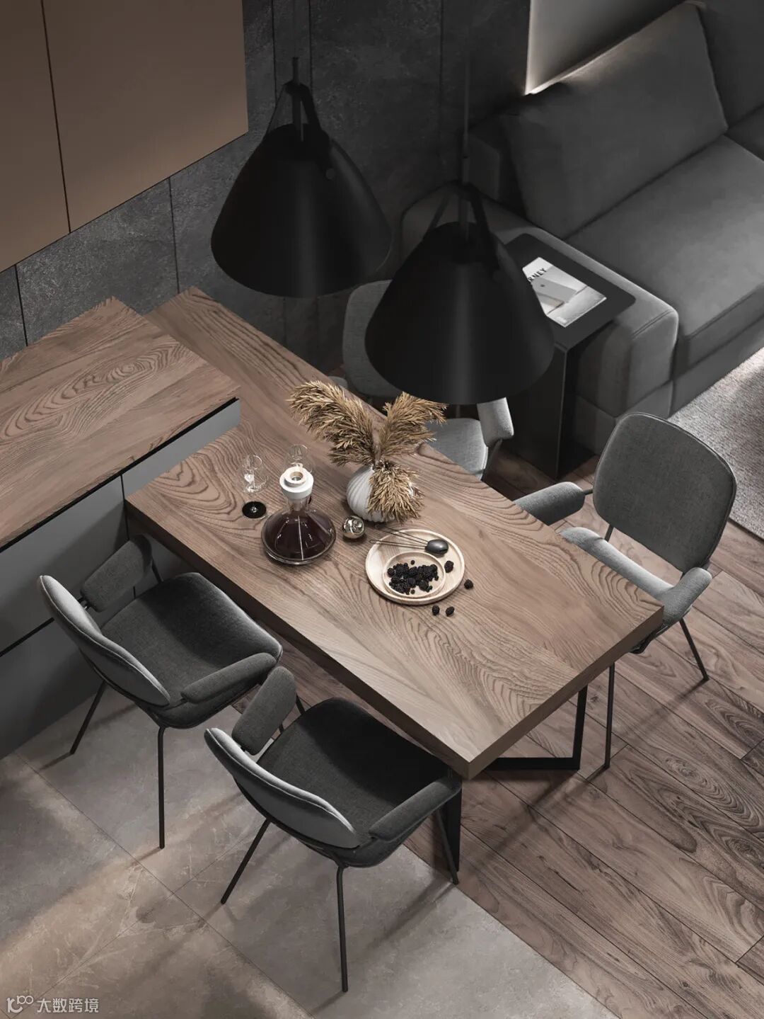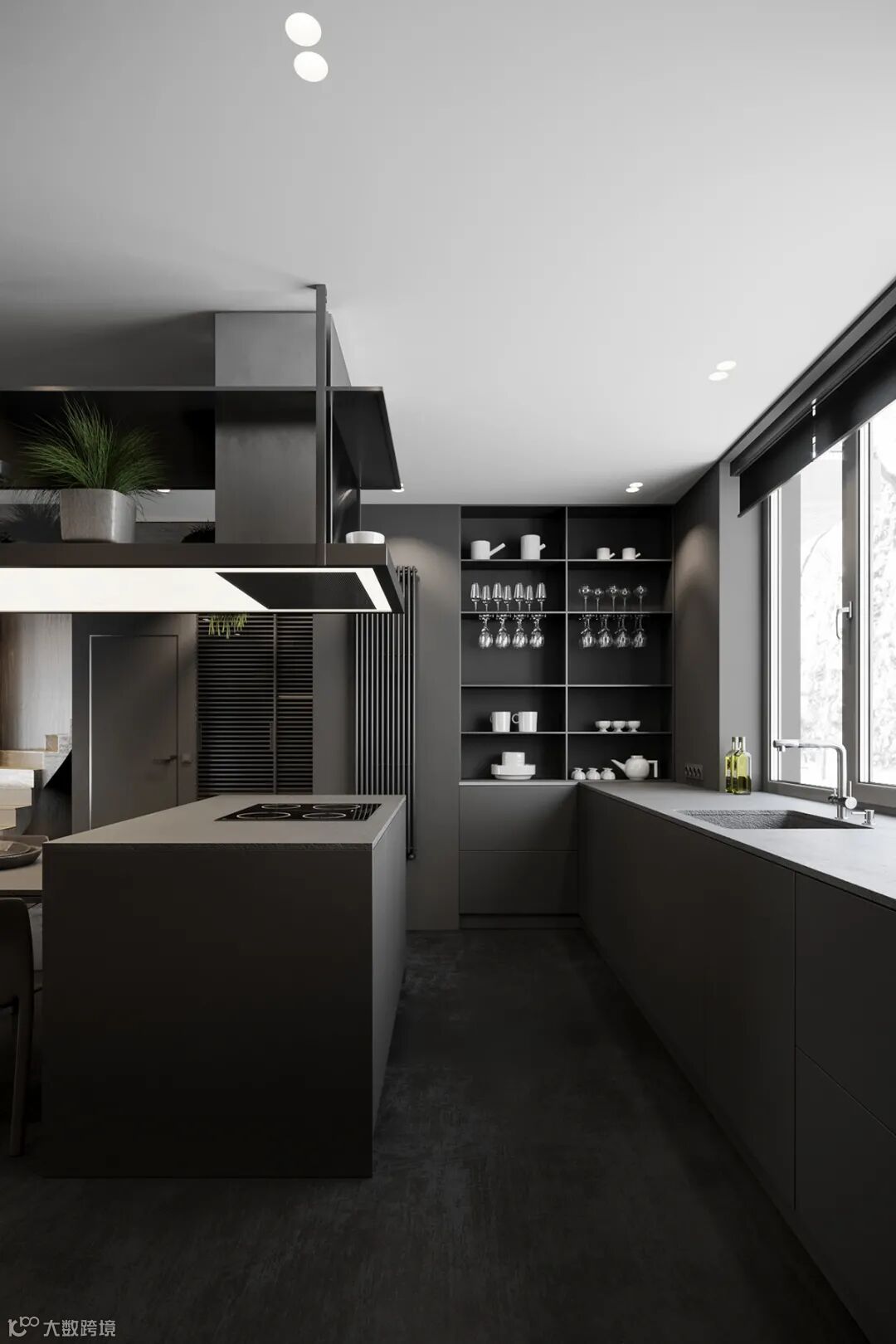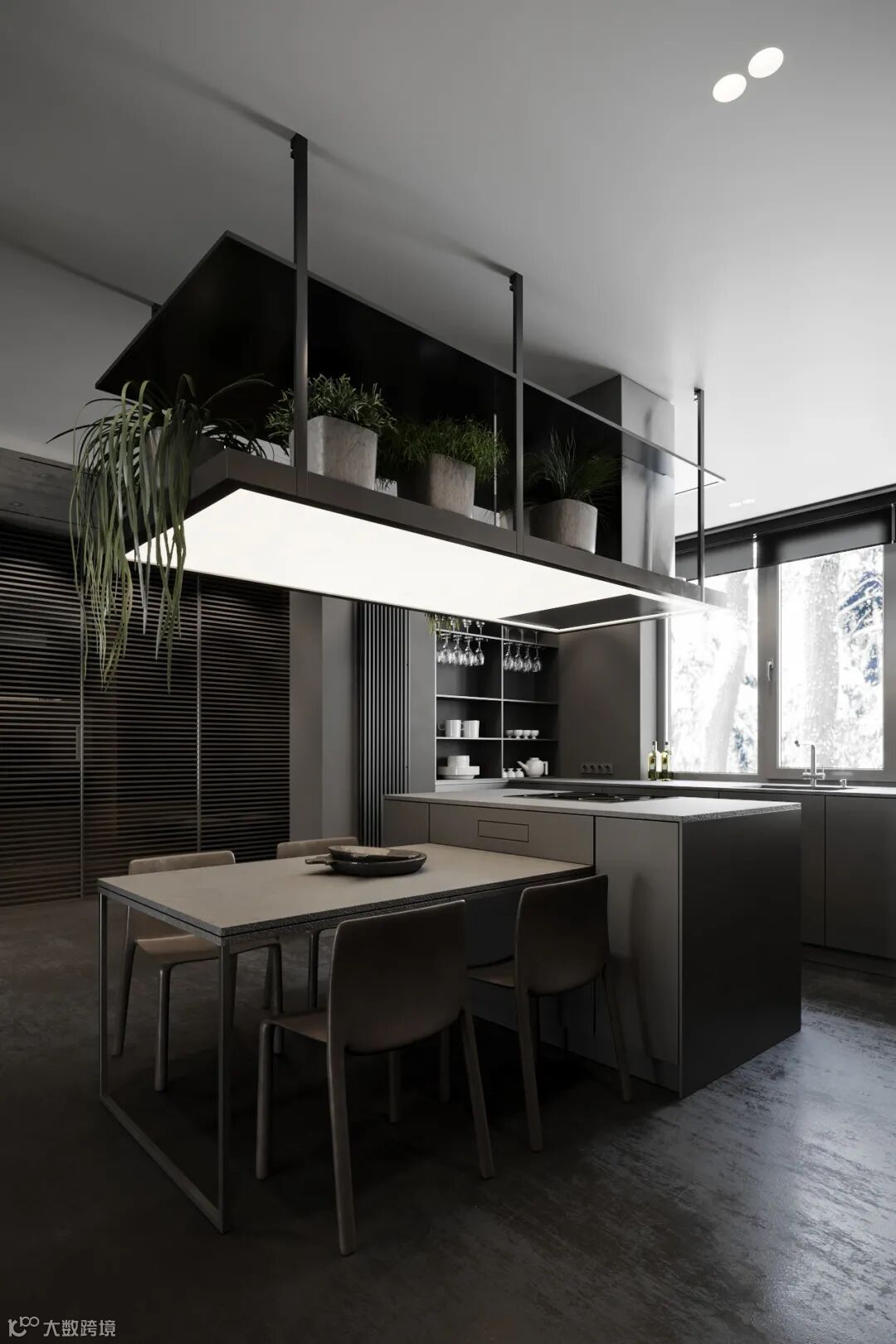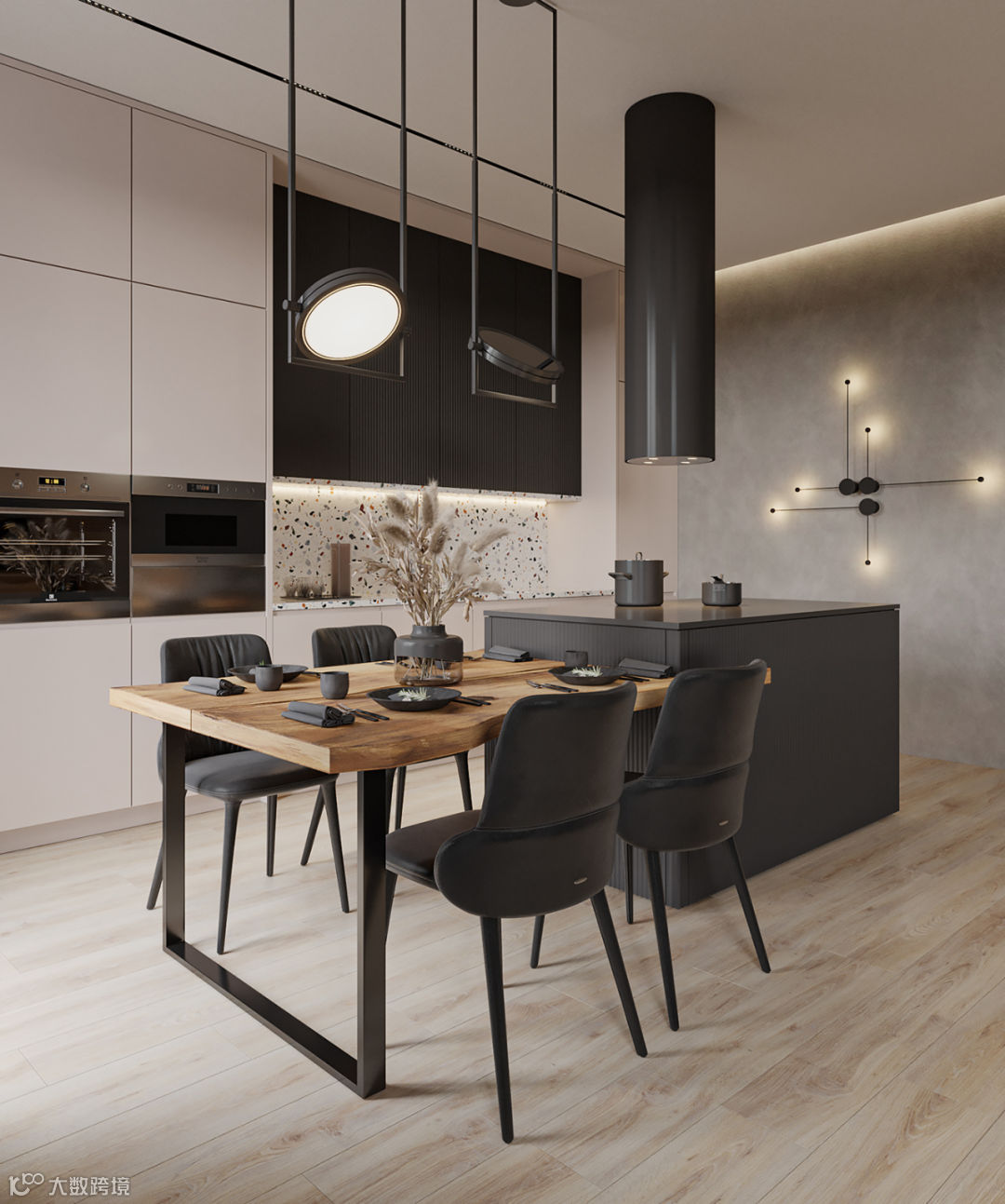 静谧优雅的厨房空间,自带高级的亲和力,另一侧整面墙的木饰面呈现,简致又彰显大气。