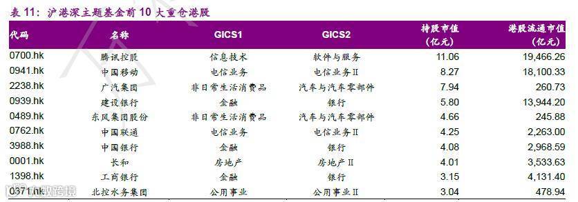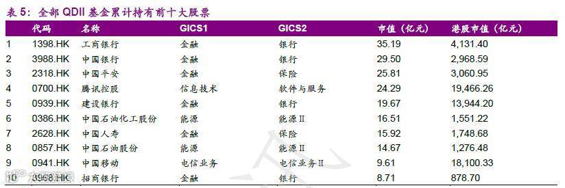 南向资金的偏好比较明显,银行、保险、汽车板块颇受青睐。而QDII和港股通主题基金所青睐的板块有细微差异。据光大证券的研究报告,QDII 基金(主动+被动型)持有金融板块股票数量和累计持仓市值占比均高于沪港深主题基金,而从累计持仓中的前十大重仓股来看,除金融板块外,沪港深主题基金更偏向汽车板块和电信板块,而QDII基金更偏向能源板块。