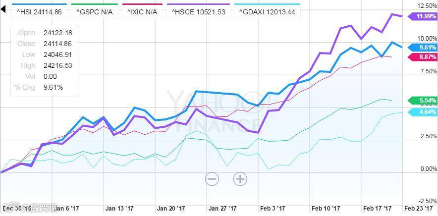 一甩过去几年的低迷,香港市场自去年底以来可谓牛气冲天。2017年迄今,恒生指数已累计上涨9.6%,恒生国企指数上涨12%,双双领跑全球主要股指。