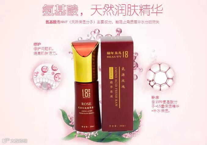 瑞年美几18氨源玫瑰精华原液是一款强有效的保湿产品,因为它是由肌肤所必须的氨基酸配以由新鲜玫瑰萃取而得的玫瑰精华为主要营养保湿成分。我们都知道氨基酸是构成蛋白质的基本元素,补充氨基酸便可以为肌肤合成蛋白质提供原料,让肌肤充盈饱满,锁住营养。玫瑰花是大家都已经耳熟能详的美容养颜圣品了,在古代便有达官贵人用玫瑰花泡澡了。而现在为了提高玫瑰花中的营养成分功效,让其发挥出更好的效果,通过高科技提纯萃取技术从而获得美容价值超高的玫瑰精华。