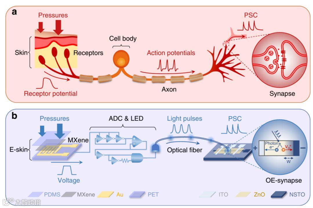 在生物体感觉系统中,信息的感觉、传递和处理依赖于分布的和并行的机械敏感性受体、神经元和突触网络,这些网络紧凑而有效地解决了现实世界中复杂的和无结构的问题,使人类能够有效地感知和处理触觉信息。携带环境特征信息的外部刺激被编码到由神经元和突触传递的动作电位中,并与神经编码和学习协同结合处理检测到的信息。受躯体感觉系统的启发,具有神经形态功能的设备已经被开发模拟生物尖峰传感和处理,目的是提高它们的性能,从而实现智能功能,如图像识别、视觉信息处理、语音识别、智能传感和神经形态计算等。
