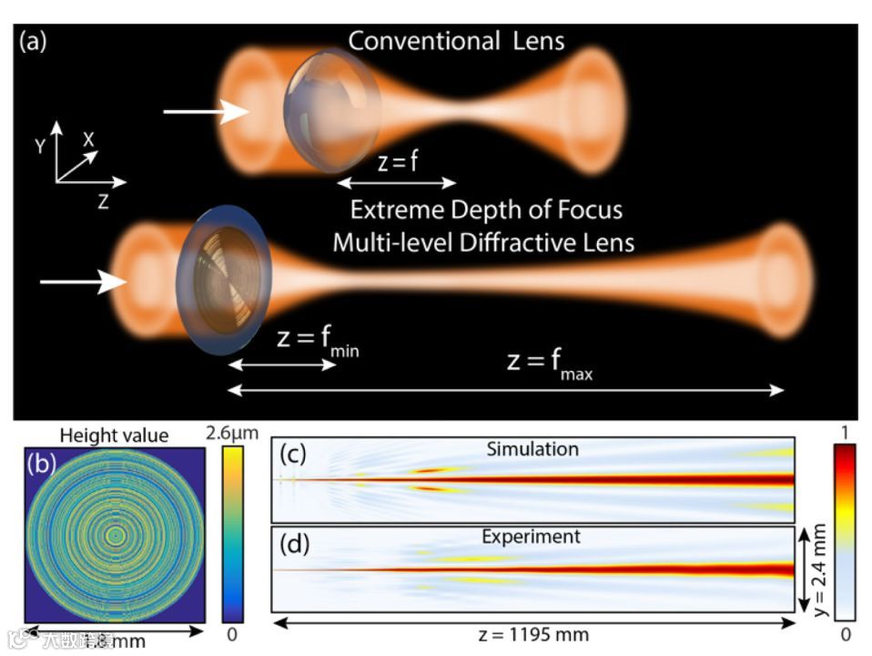 近日,美国犹他大学电子与计算机工程系Sourangsu Banerji等人通过对多级衍射透镜(MDL)的合理设计,可以大幅度提高4个数量级以上的聚焦深度。实验中,使用这种透镜,能够对相距约6米的物体保持聚焦。具体来说,当被准直光束在λ=0.85 μm时, MDL产生的光束可在5到1200 mm范围内聚焦。聚焦光束半峰全宽测量值从6.6μm(距离MDL 5 mm)到524μm(距离MDL 1200mm)不等。由于旁瓣被很好地抑制,主瓣接近衍射极限,因此在整个焦斑范围内以40° ×30°的水平垂直视场成像被证明是有可能实现的。该研究为透镜的设计开辟了一个新的方向。通过将焦平面中的相位作为一个自由参数来处理,可以实现极深聚焦成像。相关研究工作近期发表在《Optica》上。