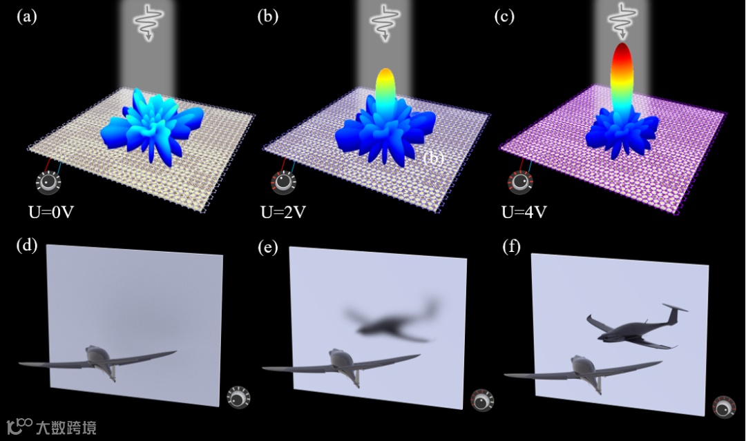 图2(a-c)不同电压下石墨烯编码超表面的散射示意图;(d-f)不同电压下相应的微波成像应用设想图。