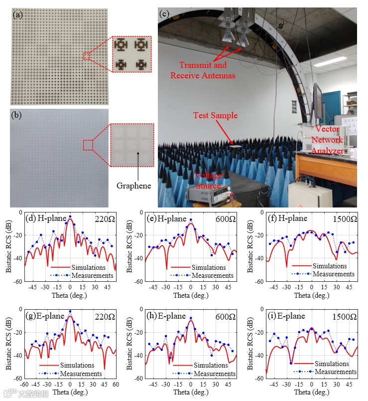 图5展示了所设计的石墨烯动态可调编码超表面的样品、测试装置以及测试结果。通过仿真与测试结果的对比可以得出:所设计石墨烯编码超表面的散射波束可以通过外加电压实现由垂直镜面反射到散向四周的漫反射的连续动态调控,验证了所提出方案的正确性。