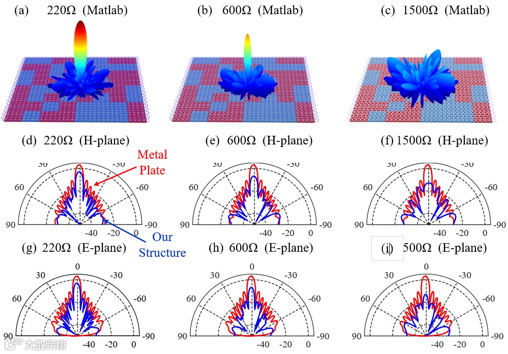 图4.(a-c)不同石墨烯表面阻抗情况下的散射波束计算结果 (d-f) 不同石墨烯表面阻抗情况下的散射波束H面仿真结果 (g-i) 不同石墨烯表面阻抗情况下的散射波束e面仿真结果。