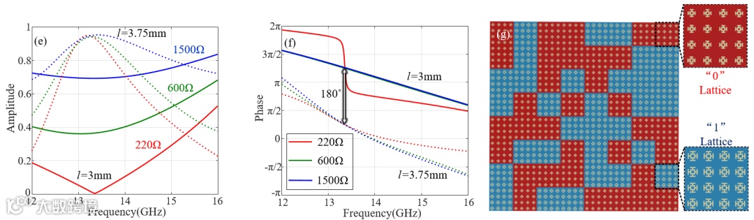 所设计的超表面的单元结构如图3(a)所示,从上到下由石墨烯三明治层、介质层、金属图案层、基底层以及金属背板组成。其中,图3(c)所示的金属图案层由耶路撒冷十字嵌套方环结构组成。当改变结构尺寸参数l时,可以实现将近360°的相位差。根据图3(d),选取l=3mm和l=3.75mm (此时相位差为180°)分别作为相位编码超表面的“0”单元与“1”单元。另一方面,石墨烯三明治层由上下两层图案化的单层石墨烯以及夹在中间的离子液层构成。在上下两层石墨烯之间加载偏置电压调控石墨烯表面阻抗从1500Ω/sq变化到220Ω/sq,从而实现反射幅度的动态调控。如图3(e-f)所示,石墨烯表面阻抗的变化对相位并不产生影响且对幅度调制具有编码选择性:在工作频点13.3GHz处,当石墨烯的表面阻抗变化时,“0”单元(l=3mm)的反射幅度可以从0.7变化到0,而“1”单元(l=3.75mm)的反射幅度始终在0.9以上。