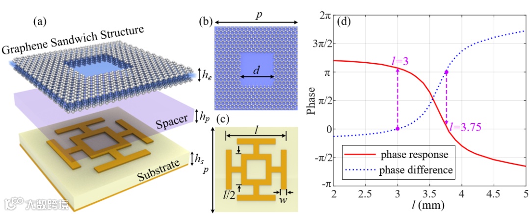 近年来,利用编码及可编程超表面对电磁波进行动态操控在波束赋形、传感探测、扫描聚焦、极化调控以及信号调制等方面展现出了广泛的应用前景。而此类超表面大多基于PIN管、变容二极管等可调电子元件以实现相位的调控,受限于电子元件的性能以及复杂的馈电网络设计。石墨烯作为一种新型二维材料,不仅具有柔性、轻薄以及光学透明等物理特性,更重要的是,它的电磁特性可以通过外加电压实现动态控制,适用于设计动态可调超表面。由于缺乏对微波频段电磁波相位信息的重构,目前微波频段石墨烯超表面大多基于幅度调制设计一些基本功能,如宽带吸波、相干吸波\透波切换等,难以实现对电磁波更为复杂的调控。