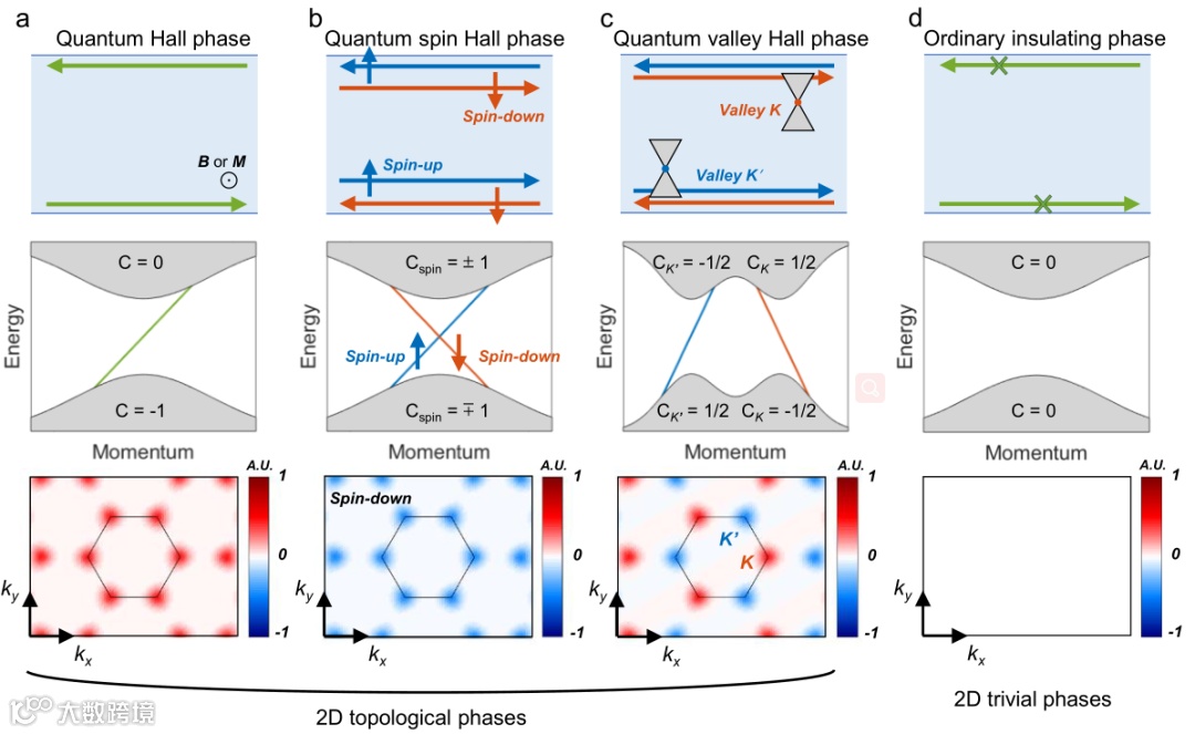 图2 量子霍尔相a,量子自旋霍尔相b,量子能谷霍尔相c,常规绝缘相d的边界态和贝里曲率。a 沿着量子霍尔相边沿的边界态具有单向传输特性,边界态的色散群速度的符号是固定的,且贝里曲率非零;b 沿着量子自旋霍尔相边沿的边界态具有自旋相关的单向传输特性,边界态的色散表现出自旋锁定的群速度,自旋向上和自旋向下分别对应贝里曲率为正和为负,表现出非零的自旋陈数,而总陈数为零;c 沿着量子能谷霍尔相边沿的边界态具有能谷相关的单向传输特性,边界态的色散表现出能谷锁定的群速度,贝里曲率具有有正有负的能谷热点,能谷陈数非零;d 常规绝缘相支持导带边界态或者非零贝里曲率。