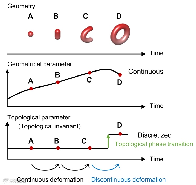 图1 几何参数与拓扑参数随时间的变化。当球面延展变为环面过程中,几何参数(如面积体积比)发生连续的变化;而拓扑参数(拓扑不变量)发生不连续的跃变,这种拓扑非平衡态之间的转变称为拓扑相变。