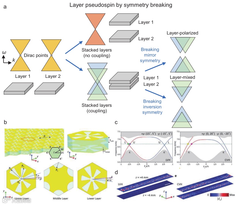 图4 利用层赝自旋获得二维光学拓扑绝缘相。a 利用对称性破缺的二维光学拓扑绝体;b 元胞;c 块体和表面的色散;d 实验测得的电场分布图;e 利用电磁对偶的层赝自旋。