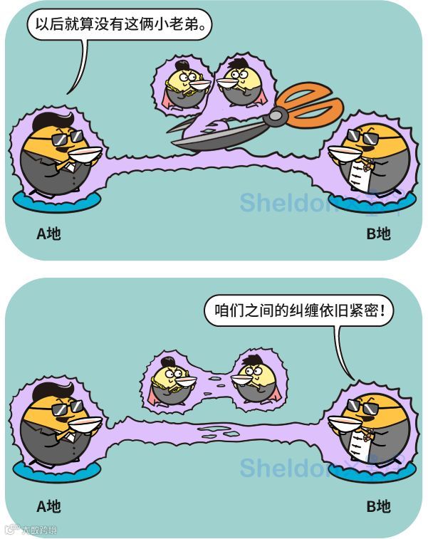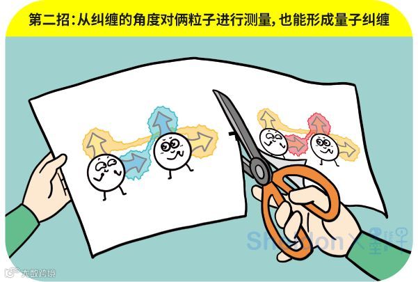 俩粒子的关系也是一样的。你要是从一个角度看,这俩粒子没纠缠。你要是从另一个角度看,俩粒子居然同时处于2种相互矛盾的纠缠态。