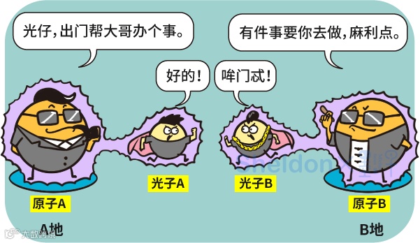 所以,研究组先是用第一招,让A地和B地的两个原子,分别和两个光子形成量子纠缠。这俩光子就是小弟。