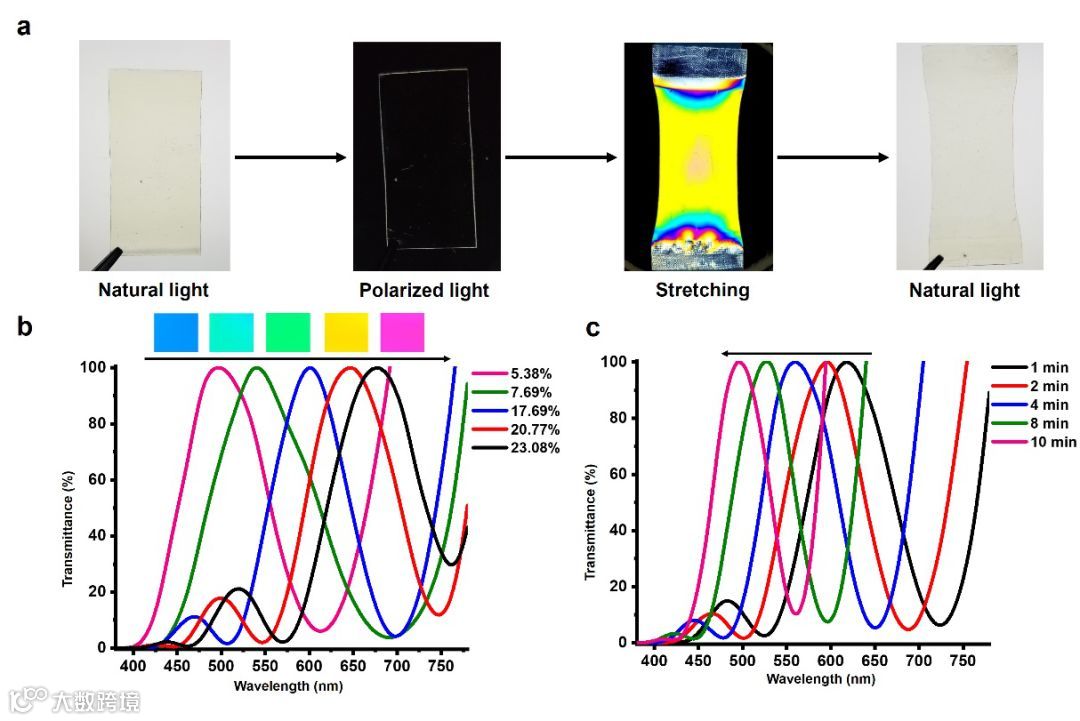 近日,清华大学许华平教授课题组通过向非晶型形状记忆聚合物网络中引入可见光响应的二硒动态共价键,成功制备出具有可见光响应性的结构色材料。该材料的结构色来源于材料在取向状态下的双折射过程。在偏振场下,寻常光和非寻常光的干涉波长与材料的取向程度有关,即与材料内应力的大小有关。通过在玻璃化转变温度(Tg)以上进行拉伸,之后冷却至室温来对材料进行取向并固定材料中的内应力,赋予材料一种背景结构色。然后利用掩模板在材料表面的特定位置施加可见光辐照,在有辐照的区域二硒键会发生动态共价交换反应,从而实现材料的可控应力松弛。形状记忆聚合物中的应力松弛能够在维持材料表面平整度不变的情况下,改变材料中特定位置的取向状态,从而实现结构色图案化过程。
