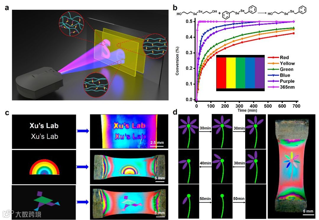 由于二硒动态交换反应的反应速率与辐照波长相关,因此通过施加不同波长、相同时间的可见光辐照,可以在材料中形成一系列不同取向状态的微区,从而实现彩色结构色图案。除此之外,通过对材料中不同区域施加同一波长、不同时间的可见光辐照,同样也可以实现彩色图案化过程。该辐照过程可以通过一台商业化的投影仪来实现,通过对软件进行编程可以使得照射过程自动进行,无需人为干预,因此该图案化过程相对简单并且不受空间地域的限制。由于图案的颜色与材料的内应力大小直接相关,因此材料中的图案一旦形成之后还可以进行光擦除,并经过重新拉伸之后可以再次实现图案化过程。
