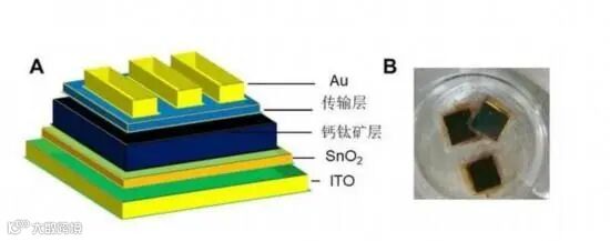 钙钛矿太阳能电池的结构(A)和实物(B)