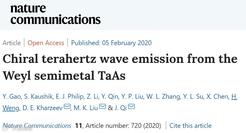 近日,来自电子科技大学的齐静波课题组与合作者一起,在拓扑外尔半金属TaAs中发现了可调控的宽带手性太赫兹波发射(chiral terahertz wave emission),并揭示了该发现与外尔物理间的相互关系。研究成果以“Chiral Terahertz Wave Emission from the Weyl Semimetal TaAs”为题发表于在Nature Communications上。