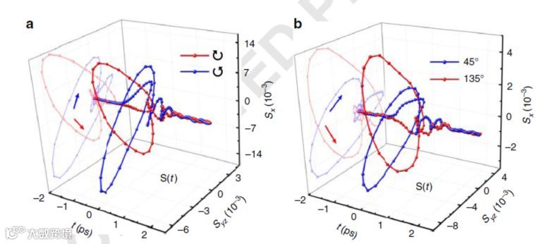图1 外尔半金属中的时域太赫兹发射谱。改变入射飞秒激光的偏振态(不同圆偏振或线偏振)可以调控发射的太赫兹波性质,包括手性(用不同颜色代表)、椭偏性和强度。