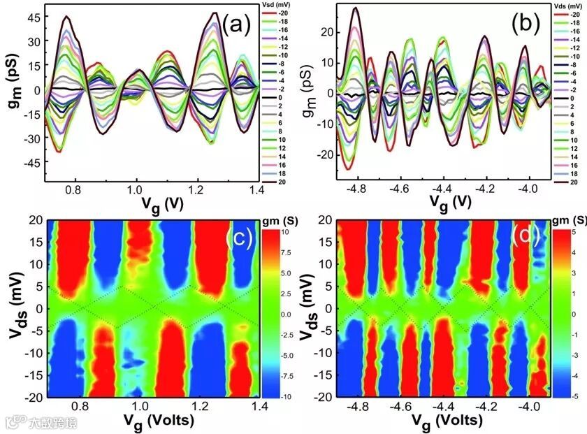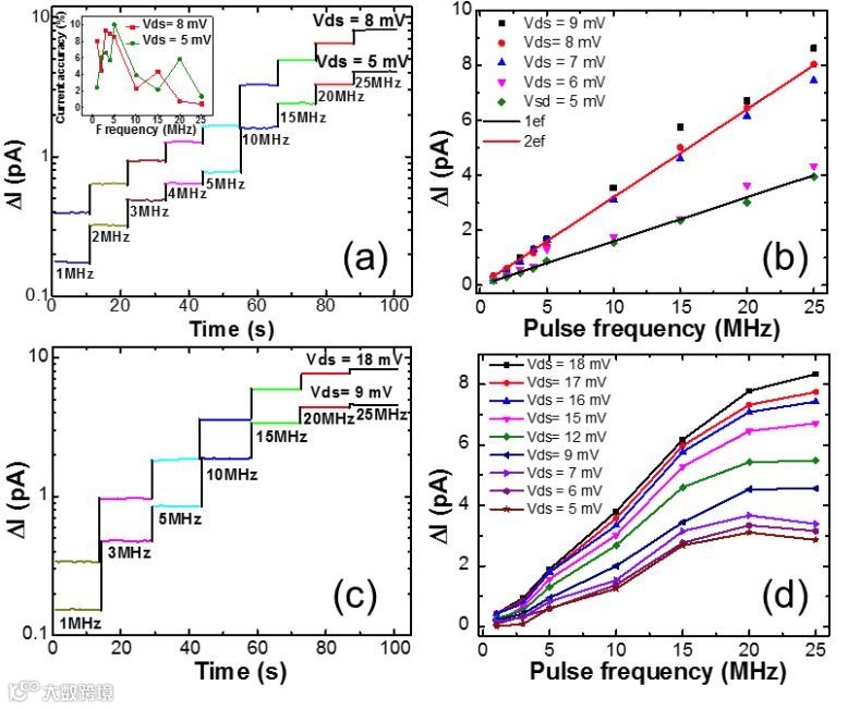 研究结果显示,在4.2 K温度下,单根ZnO纳米带晶体管表现出了明显的库仑振荡。周期性的菱形库仑区域表明库仑振荡是由ZnO纳米带中均匀尺寸的单量子点引起的,而准周期的菱形库仑区域对应于多量子点的贡献。通过施加变化频率的背栅交流信号,研究人员实现了单电子泵浦和双电子泵浦。并且,在25 MHz的高频率下,单电子和双电子泵浦的电流精度均达到1%左右。这种精确的单电子泵浦使得ZnO纳米带器件适用于单自旋注入和探测,在量子信息技术中具有巨大的应用潜力。