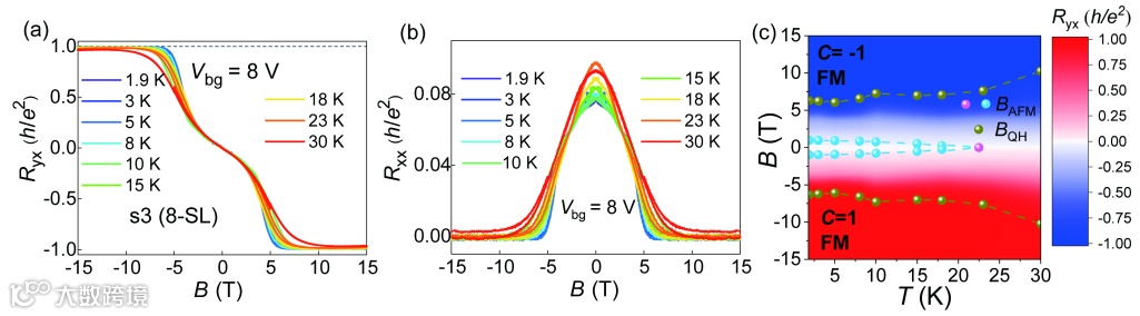 图3:(a),(b) 8个“七重层”MnBi2Te4器件中C=1的高温反常量子霍尔效应;(c) 8个“七重层”MnBi2Te4器件中C=1的高温反常量子霍尔效应相图。