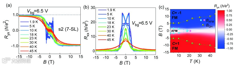 图2:(a),(b) 7个“七重层”MnBi2Te4器件中C=1的高温反常量子霍尔效应;(c) 7个“七重层”MnBi2Te4器件中C=1的高温反常量子霍尔效应相图。