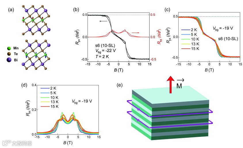 图1:(a) 两层MnBi2Te4 的原子结构示意图;(b) 高陈数 (C=2)反常量子霍尔效应;(c), (d) 高陈数 (C=2)反常量子霍尔效应变温结果;(e) 具有两个无耗散边界态的陈绝缘体态示意图。